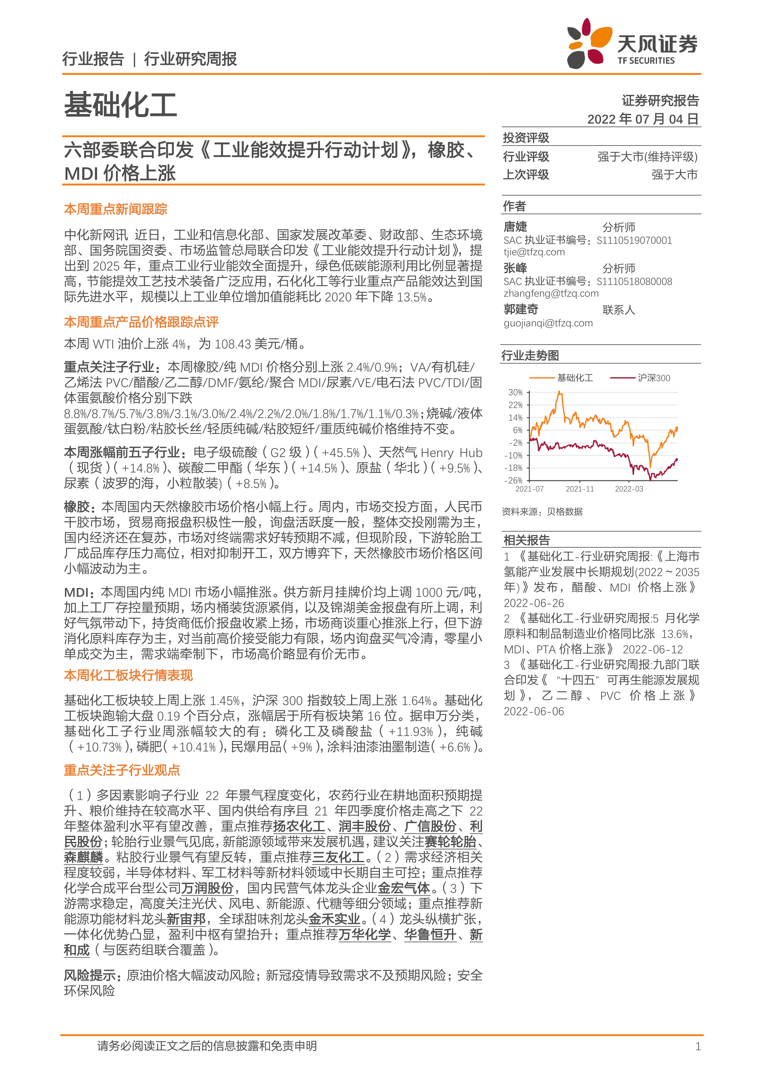 基础化工行业研究周报:六部委联合印发《工业能效提升行动计划》,橡胶、MDI价格上涨