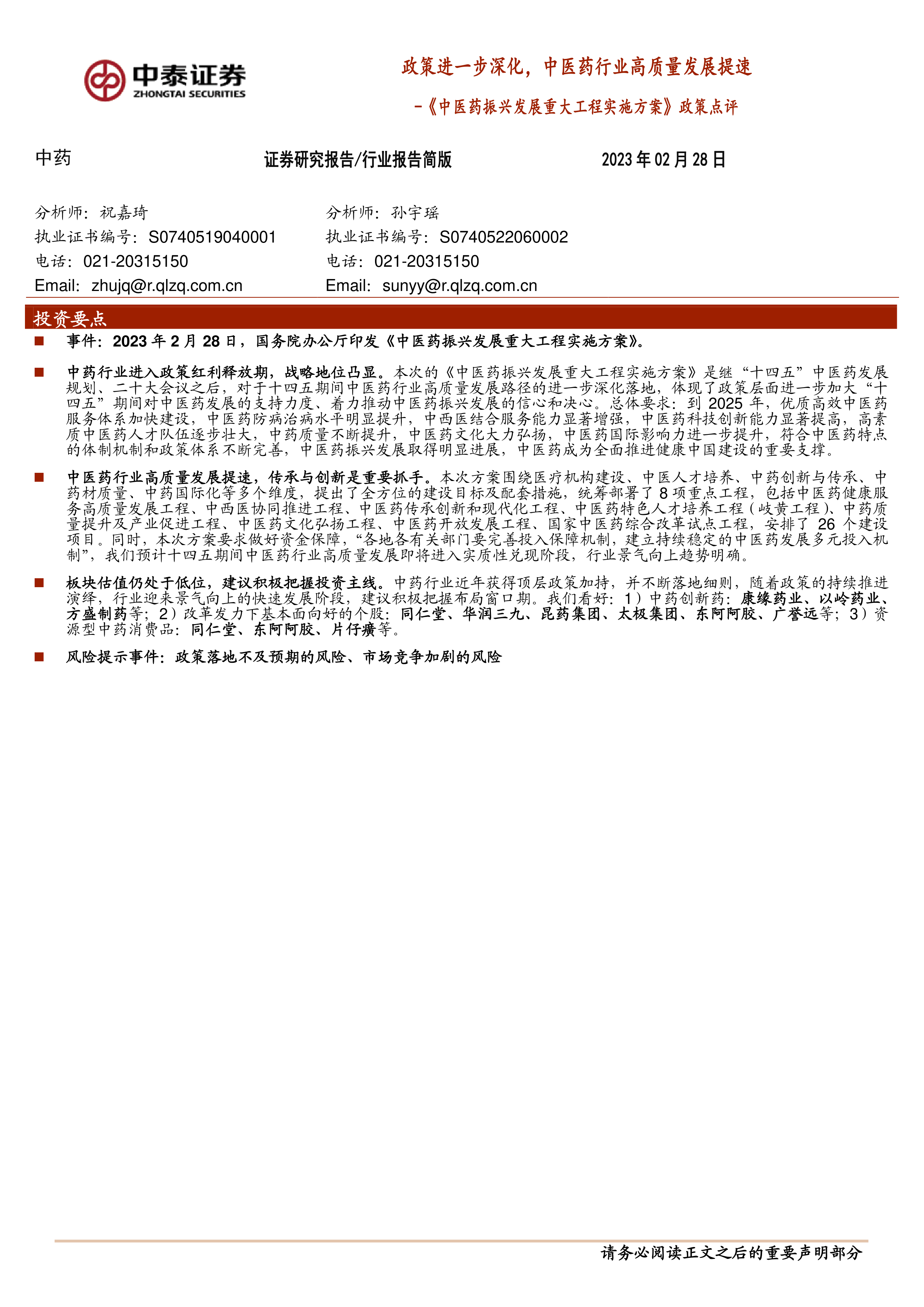本报告主要围绕《中医药振兴发展重大工程实施方案》展开分析,内容涵盖政策解读、行业发展趋势以及投资建议等多个方面。