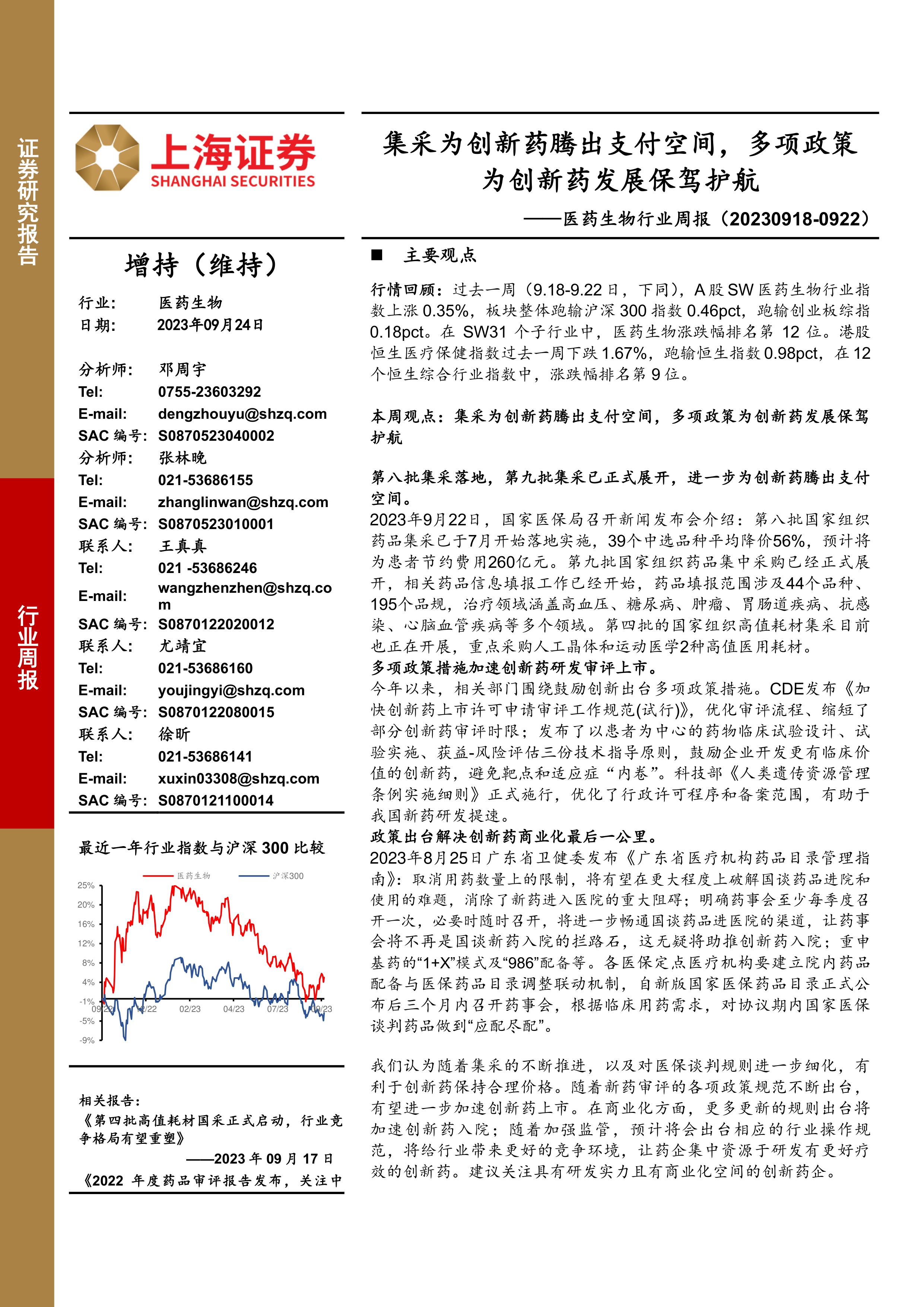 行情回顾:过去一周(9.18-9.22日,下同),A 股 SW 医药生物行业指数上涨 0.35%,板块整体跑输沪深 300 指数 0.46pct,跑输创业板综指0.18pct。在 SW31 个子行业中,医药生物涨跌幅排名第 12 位。港股恒生医疗保健指数过去一周下跌 1.67%,跑输恒生指数 0.98pct,在 12个恒生综合行业指数中,涨跌幅排名第 9 位。