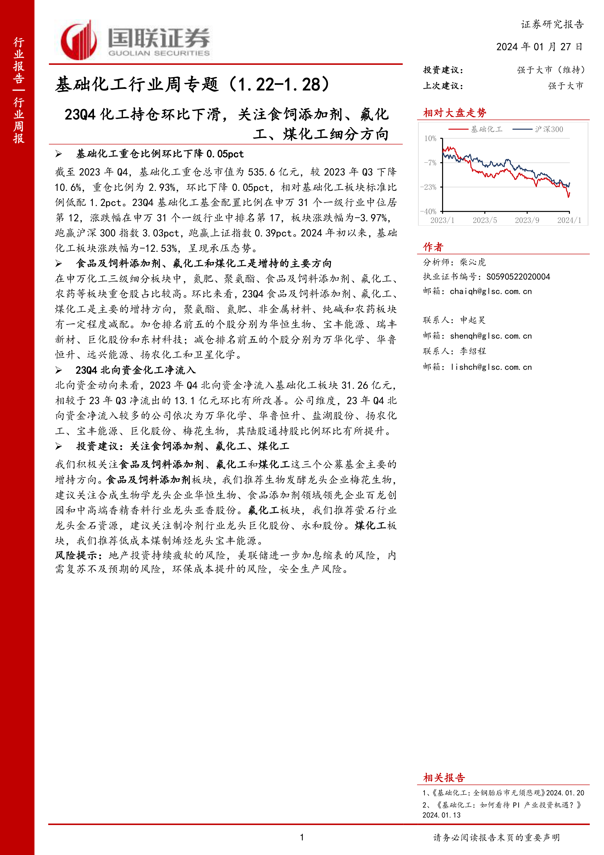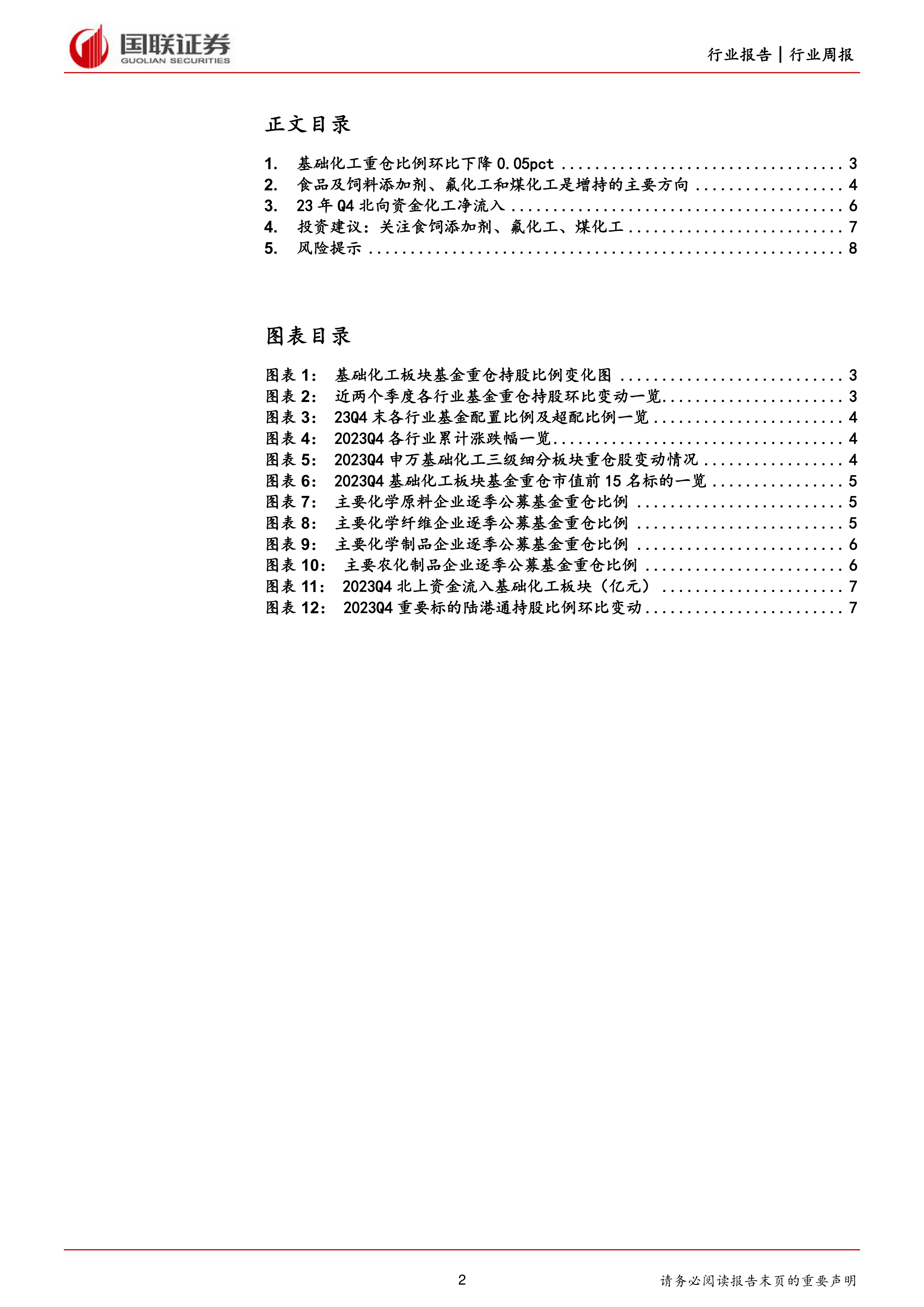 基础化工行业周专题:23Q4化工持仓环比下滑,关注食饲添加剂、氟化工、煤化工细分方向