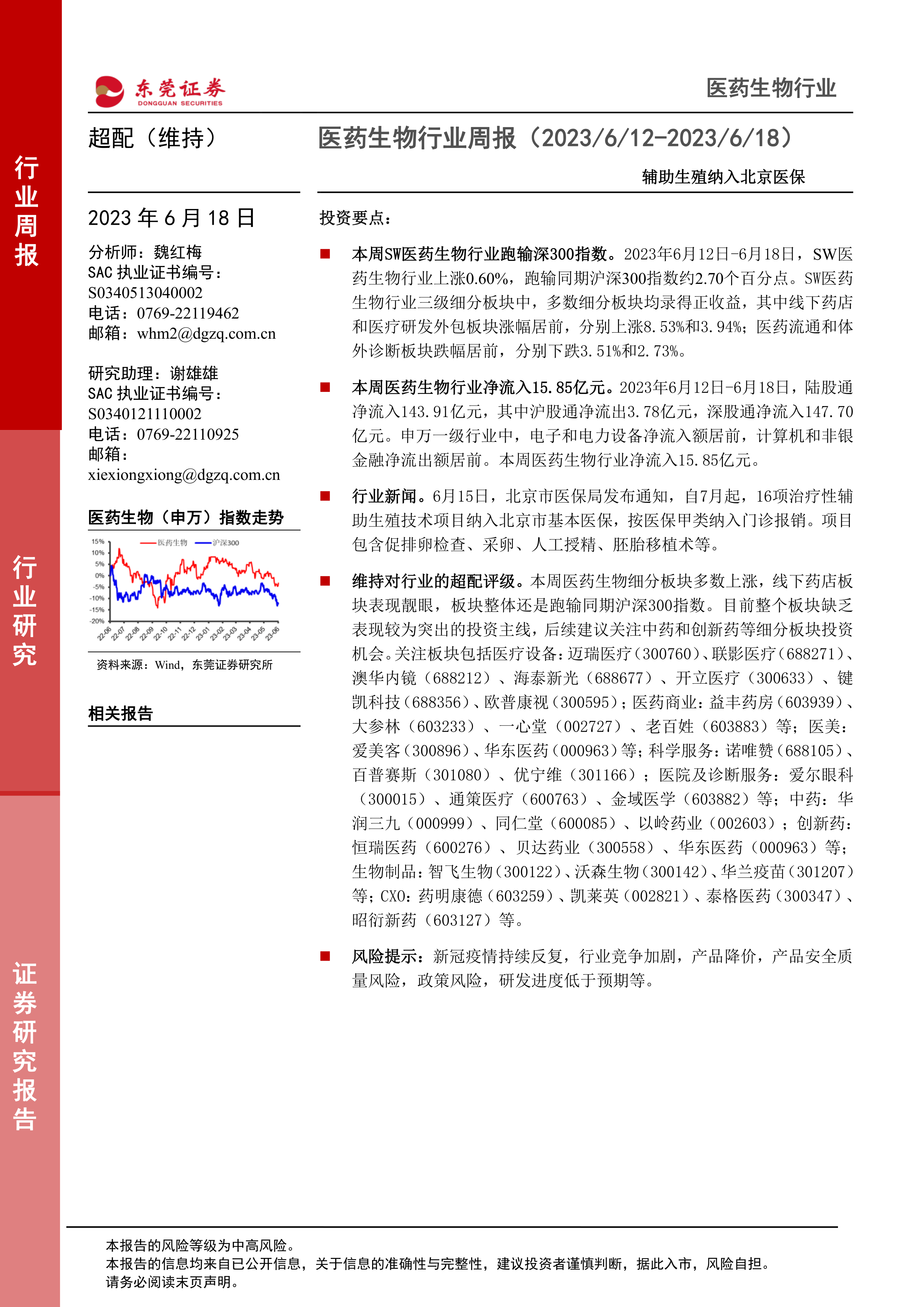 本报告对2023年6月12日至18日SW医药生物行业进行了全面分析,涵盖了行业整体表现、细分板块表现、陆股通资金流向、行业新闻、上市公司公告以及投资建议等方面。 报告指出,尽管部分细分板块表现亮眼,但整体而言,医药生物行业本周跑输沪深300指数,缺乏明确的投资主线。 报告维持对该行业的超配评级,并建议投资者关注中药和创新药等细分板块,同时需谨慎评估包括疫情反复、政策风险、研发风险等在内的多种投资风险。 报告数据主要来自Wind数据库,投资者应谨慎判断,风险自担。