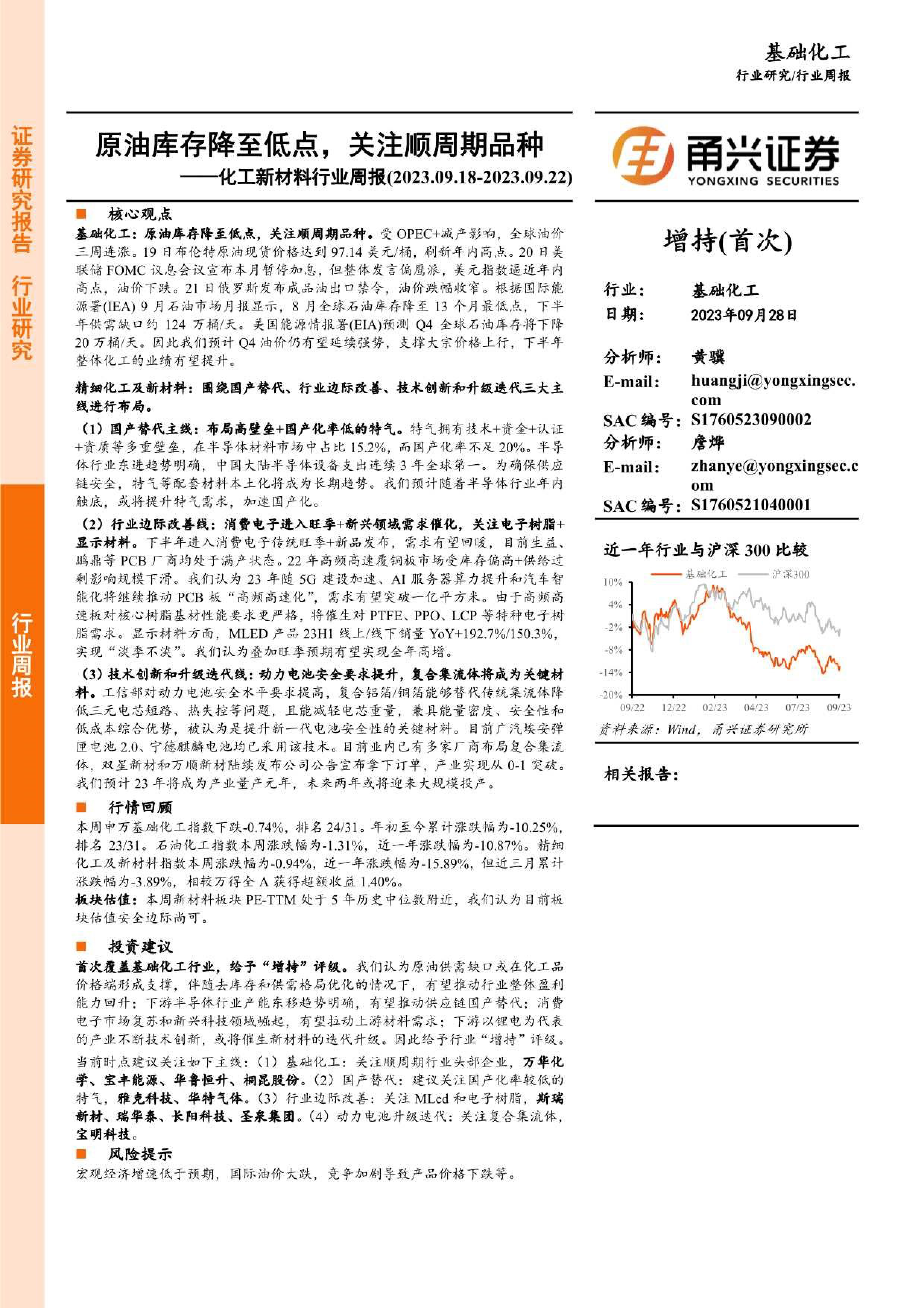 基础化工:原油库存降至低点,关注顺周期品种。受OPEC+减产影响,全球油价三周连涨。19日布伦特原油现货价格达到97.14美元/桶,刷新年内高点。20日美联储FOMC议息会议宣布本月暂停加息,但整体发言偏鹰派,美元指数逼近年内高点,油价下跌。21日俄罗斯发布成品油出口禁令,油价跌幅收窄。根据国际能源署(IEA)9月石油市场月报显示,8月全球石油库存降至13个月最低点,下半年供需缺口约124万桶/天。美国能源情报暑(EIA)预测Q4全球石油库存将下降20万桶/天。因此我们预计Q4油价仍有望延续强势,支撑大宗价格上行,下半年整体化工的业绩有望提升。