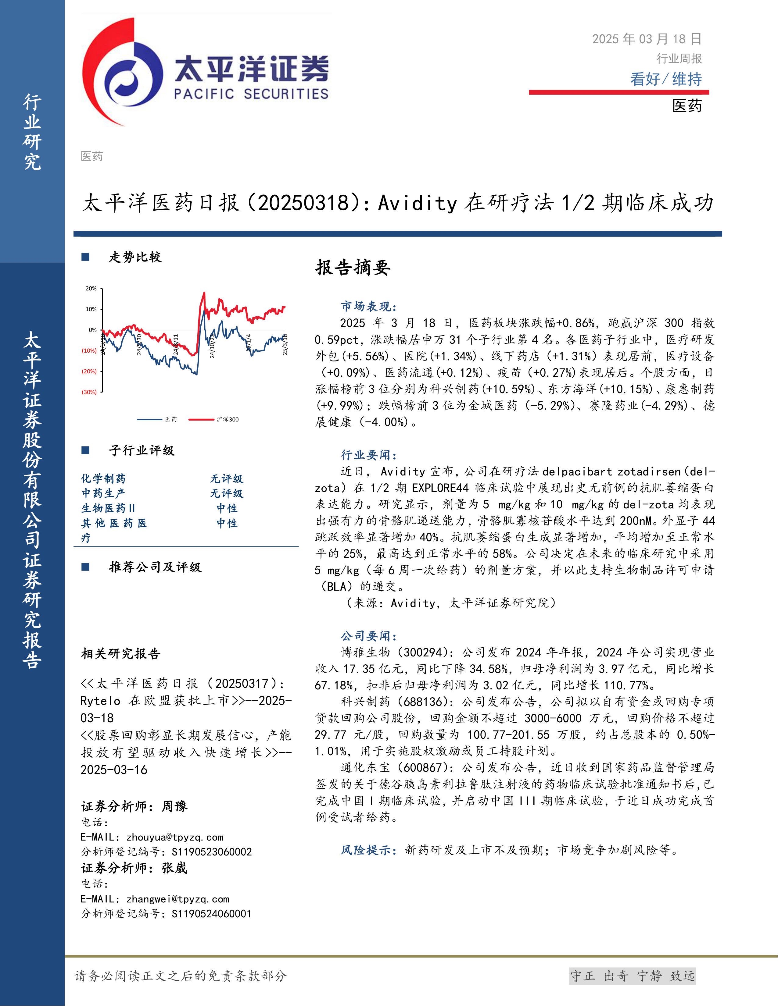 本报告的核心观点是:2025年3月18日,医药板块整体表现良好,跑赢沪深300指数。Avidity公司在研疗法的临床试验成功是推动板块上涨的重要因素之一。部分个股表现突出,但也存在个股下跌的情况。报告对医药行业子行业及部分公司进行了评级,并提供了投资建议。