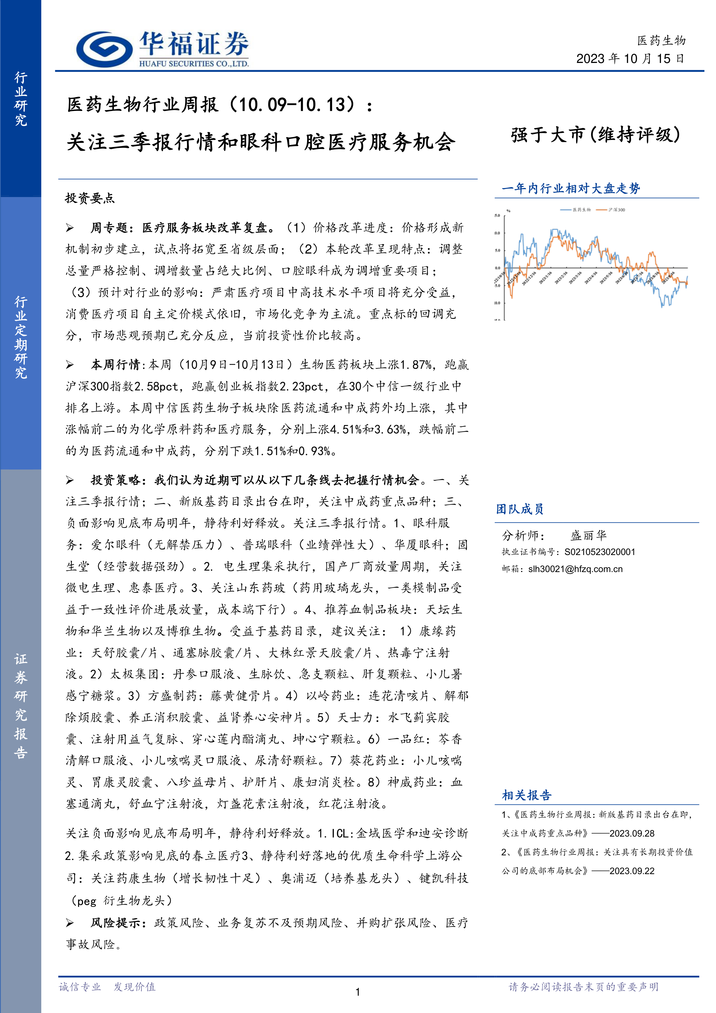 投资策略:我们认为近期可以从以下几条线去把握行情机会。一、关注三季报行情;二、新版基药目录出台在即,关注中成药重点品种;三、负面影响见底布局明年,静待利好释放。关注三季报行情。1、眼科服务:爱尔眼科(无解禁压力)、普瑞眼科(业绩弹性大)、华厦眼科;固生堂(经营数据强劲)。2.电生理集采执行,国产厂商放量周期,关注微电生理、惠泰医疗。3、关注山东药玻(药用玻璃龙头,一类模制品受益于一致性评价进展放量,成本端下行)。4、推荐血制品板块:天坛生物和华兰生物以及博雅生物。受益于基药目录,建议关注:1)康缘药业:天舒胶囊/片、通塞脉胶囊/片、大株红景天胶囊/片、热毒宁注射液。2)太极集团:丹参口服液、生脉饮、急支颗粒、肝复颗粒、小儿暑感宁糖浆。3)方盛制药:藤黄健骨片。4)以岭药业:连花清咳片、解郁除烦胶囊、养正消积胶囊、益肾养心安神片。5)天士力:水飞蓟宾胶囊、注射用益气复脉、穿心莲内酯滴丸、坤心宁颗粒。6)一品红:芩香清解口服液、小儿咳喘灵口服液、尿清舒颗粒。7)葵花药业:小儿咳喘灵、胃康灵胶囊、八珍益母片、护肝片、康妇消炎栓。8)神威药业:血塞通滴丸,舒血宁注射液,灯盏花素注射液,红花注射液。