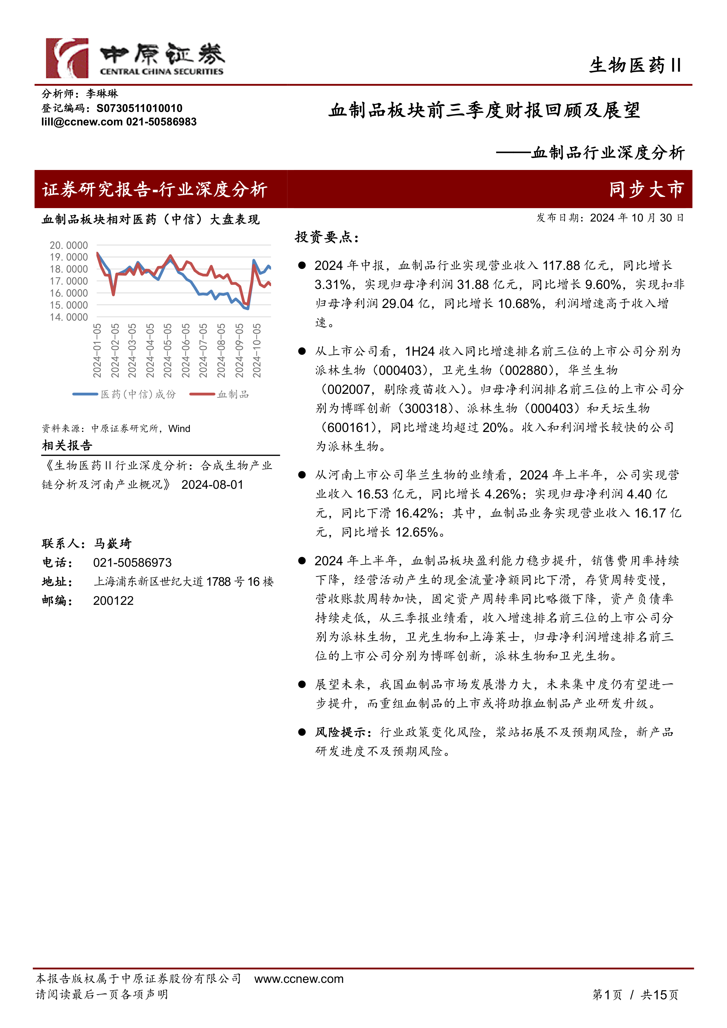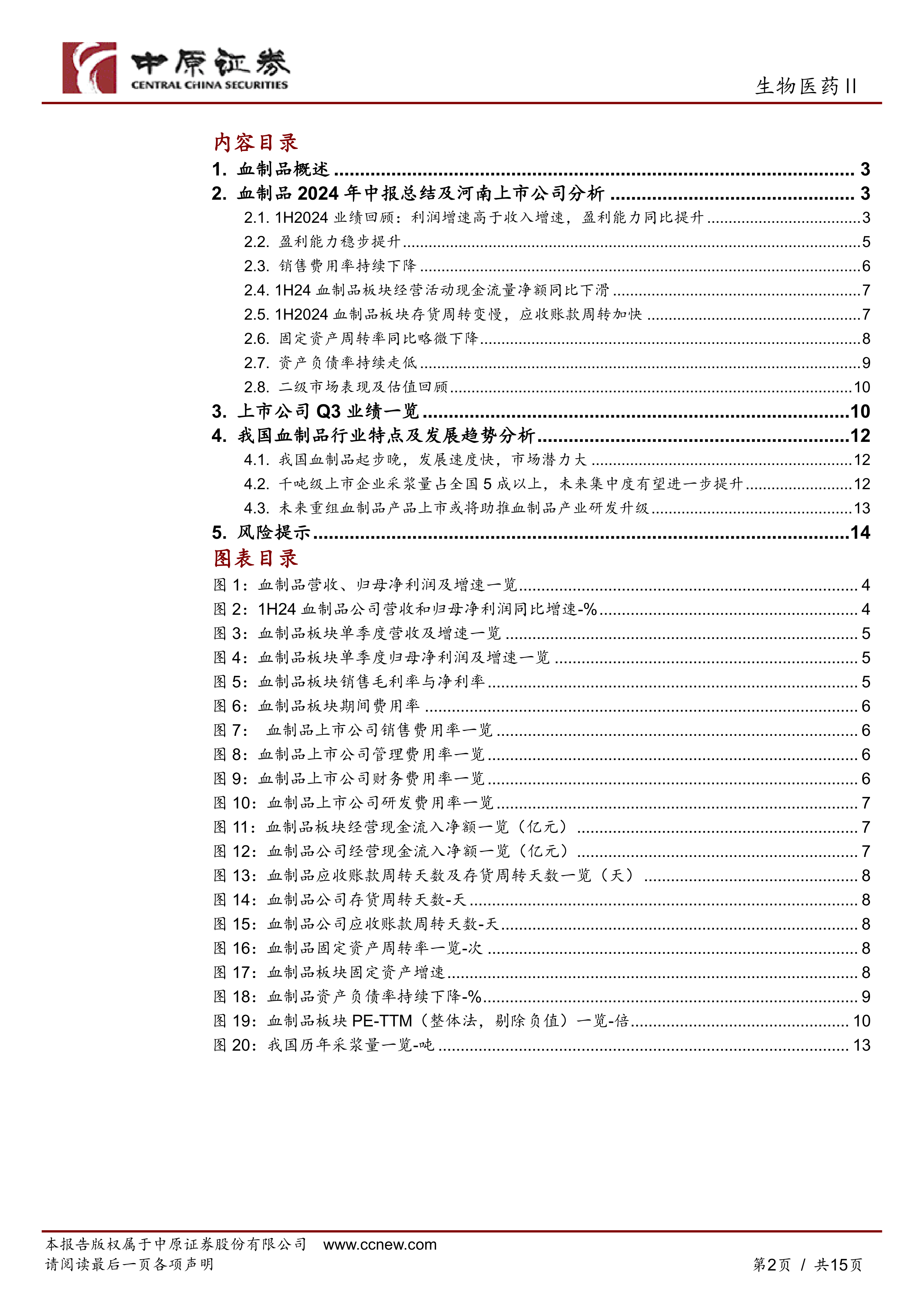 本报告基于中原证券对血制品板块2024年前三季度财报的分析,核心观点如下: