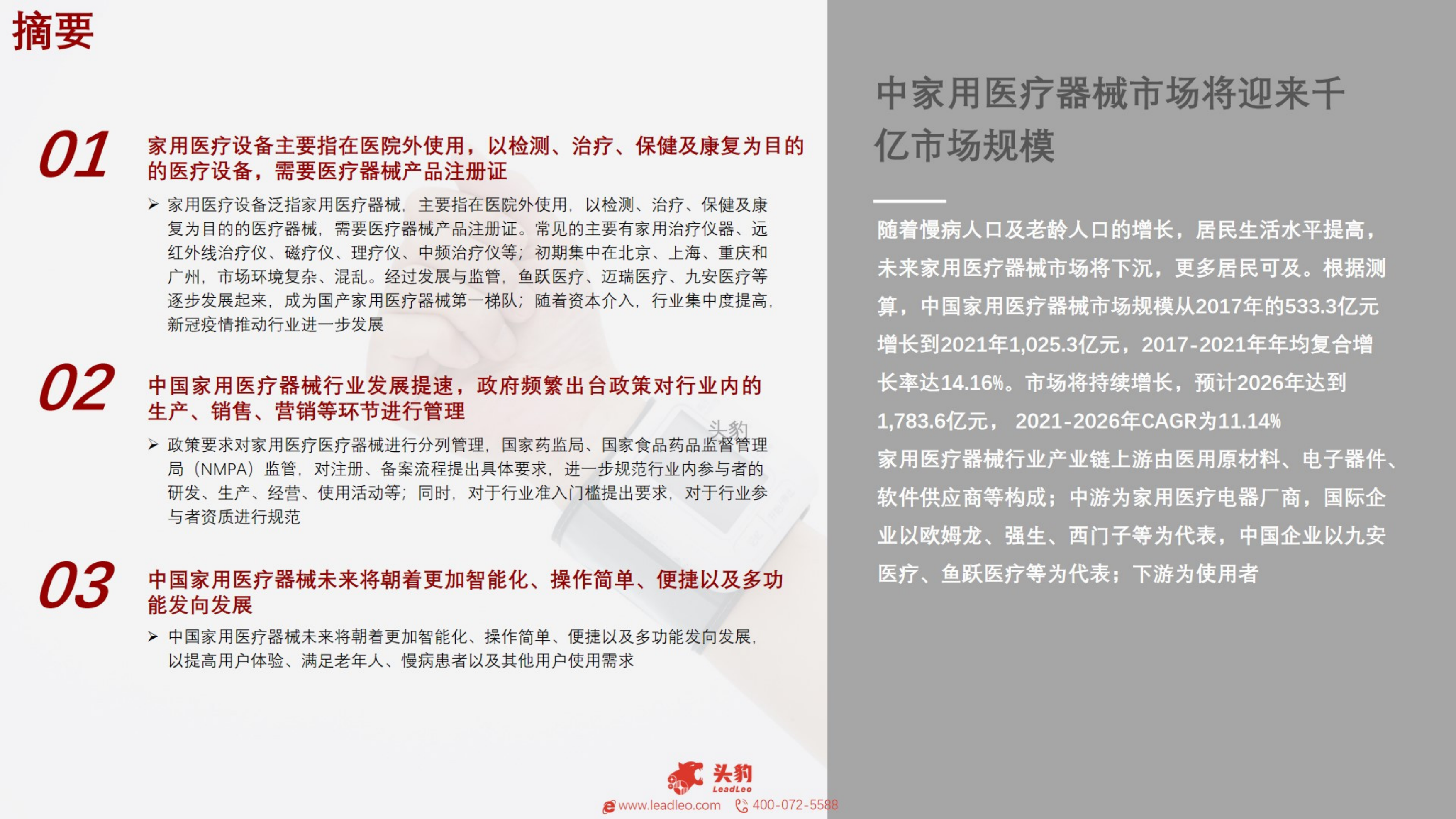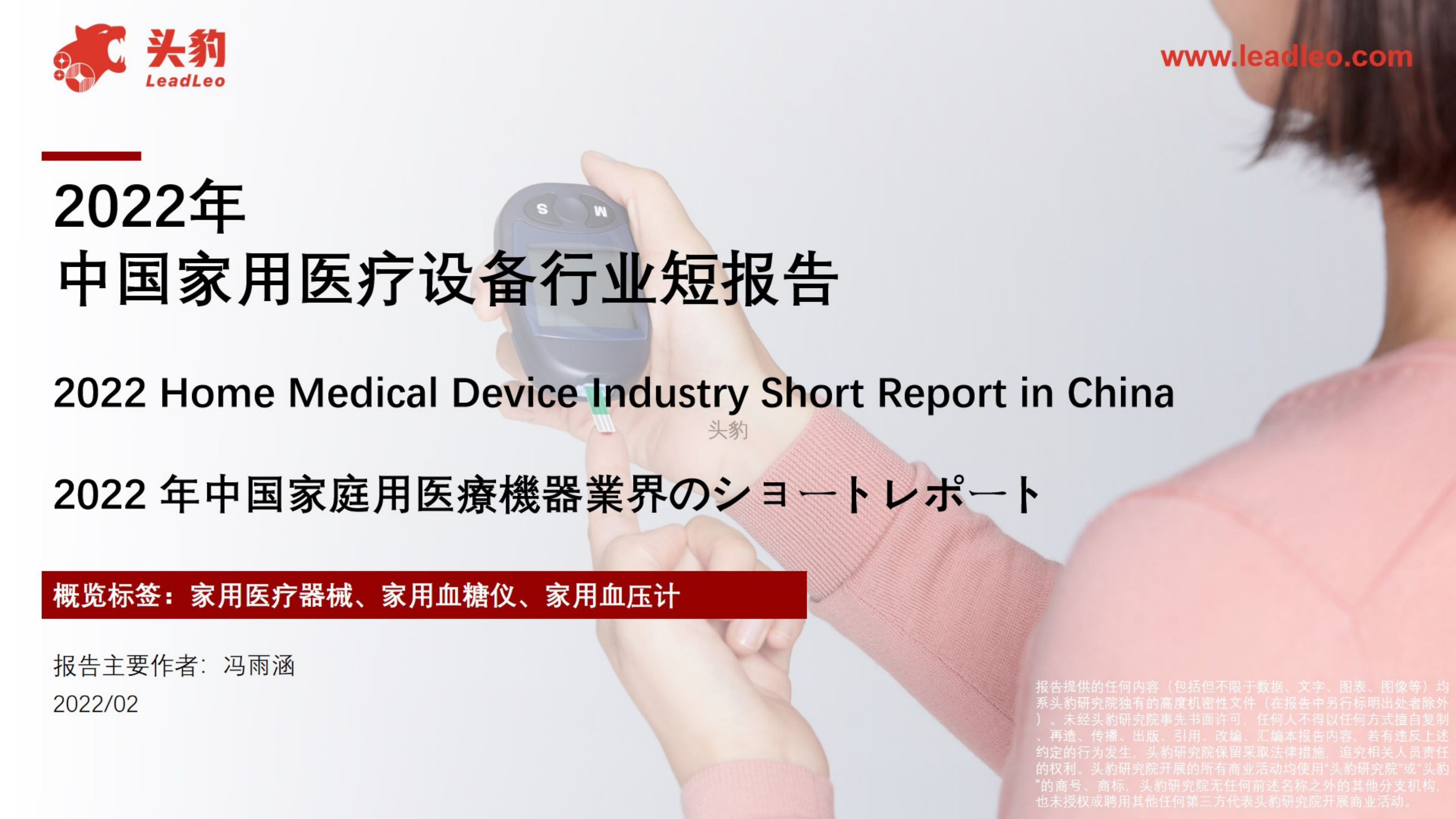 家用医疗设备泛指家用医疗器械,主要指在医院外使用,以检测、治疗、保健及康复为目的的医疗器械,需要医疗器械产品注册证。常见的主要有家用治疗仪器、远红外线治疗仪、磁疗仪、理疗仪、中频治疗仪等;初期集中在北京、上海、重庆和广州.市场环堍g杂、混乱。经过发展与监管,鱼跃医疗、迈瑞医疗、九安医疗等逐步发展起来.成为国产家用医疗器械第一梯队;随着资本介入.行业集中度提高.新冠疫情推动行业进一步发展