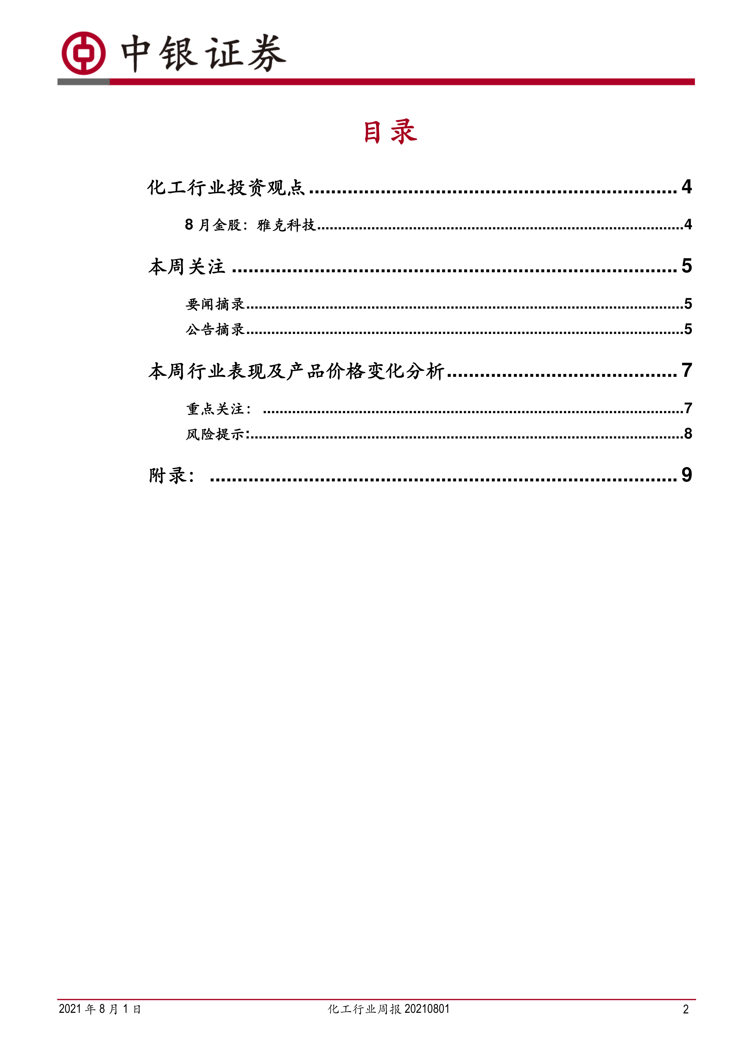 本报告为2021年8月1日化工行业周报,主要内容包括行业整体表现分析、重点产品价格变化、行业动态以及投资建议等方面。