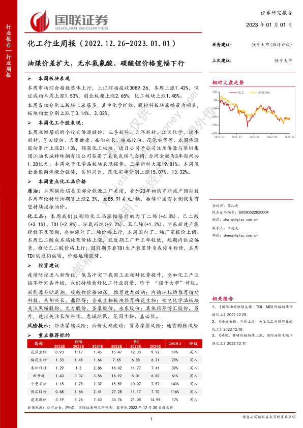 本报告对2022年12月26日至2023年1月1日期间的化工行业进行了周度分析。报告显示,本周化工板块整体表现强劲,但部分化工品价格下跌,且宏观经济环境存在不确定性。基于此,报告维持对化工行业的“强于大市”评级,并推荐了多个投资主线和重点标的,同时提醒投资者关注相关风险。 报告内容涵盖了市场行情、重点化工品价格、公司公告、行业新闻以及投资建议等方面,为投资者提供了较为全面的行业信息和投资参考。