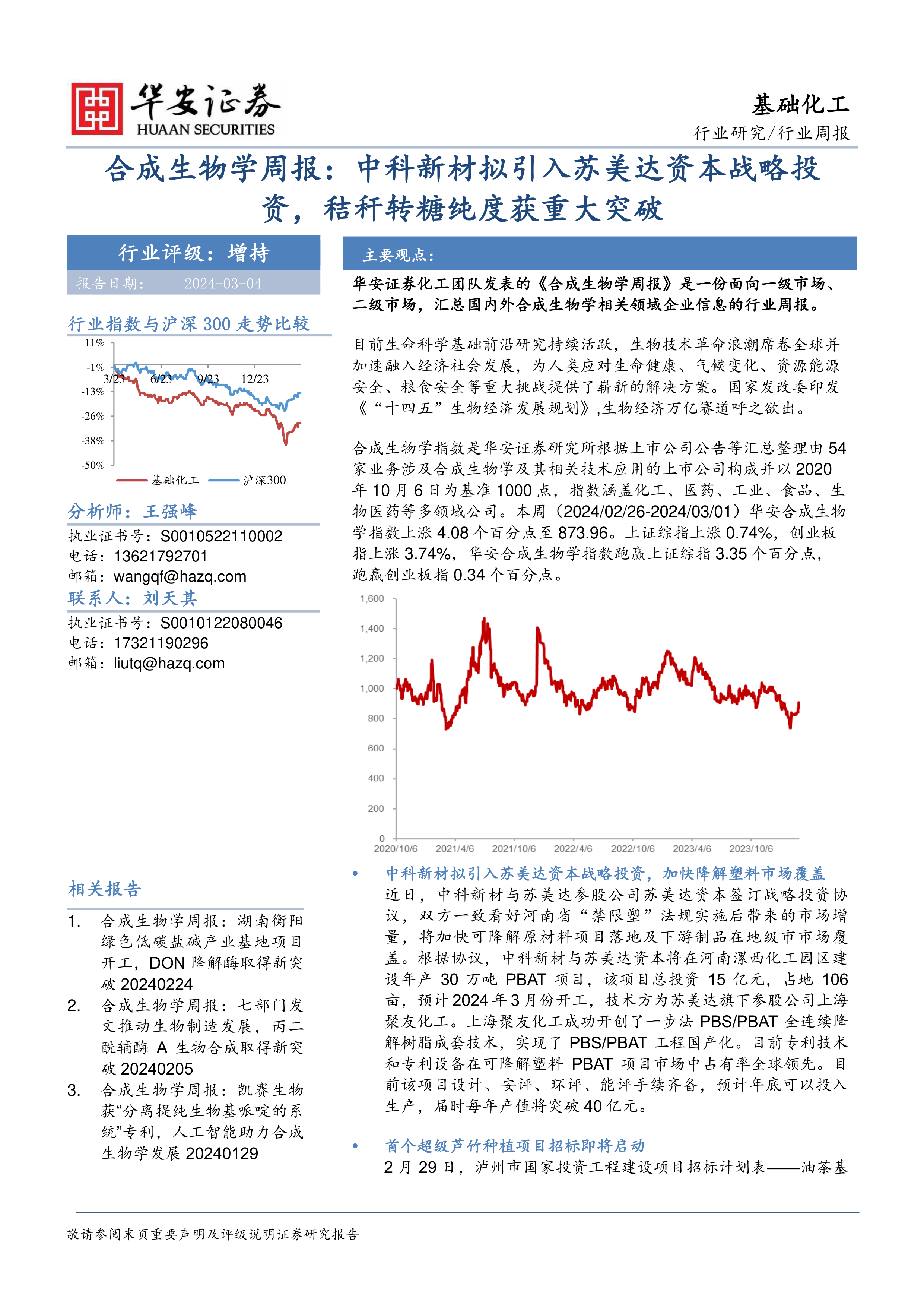 合成生物学指数是华安证券研究所根据上市公司公告等汇总整理由54家业务涉及合成生物学及其相关技术应用的上市公司构成并以2020年10月6日为基准1000点,指数涵盖化工、医药、工业、食品、生物医药等多领域公司。本周(2024/02/26-2024/03/01)华安合成生物学指数上涨4.08个百分点至873.96。上证综指上涨0.74%,创业板指上涨3.74%,华安合成生物学指数跑赢上证综指3.35个百分点,跑赢创业板指0.34个百分点。