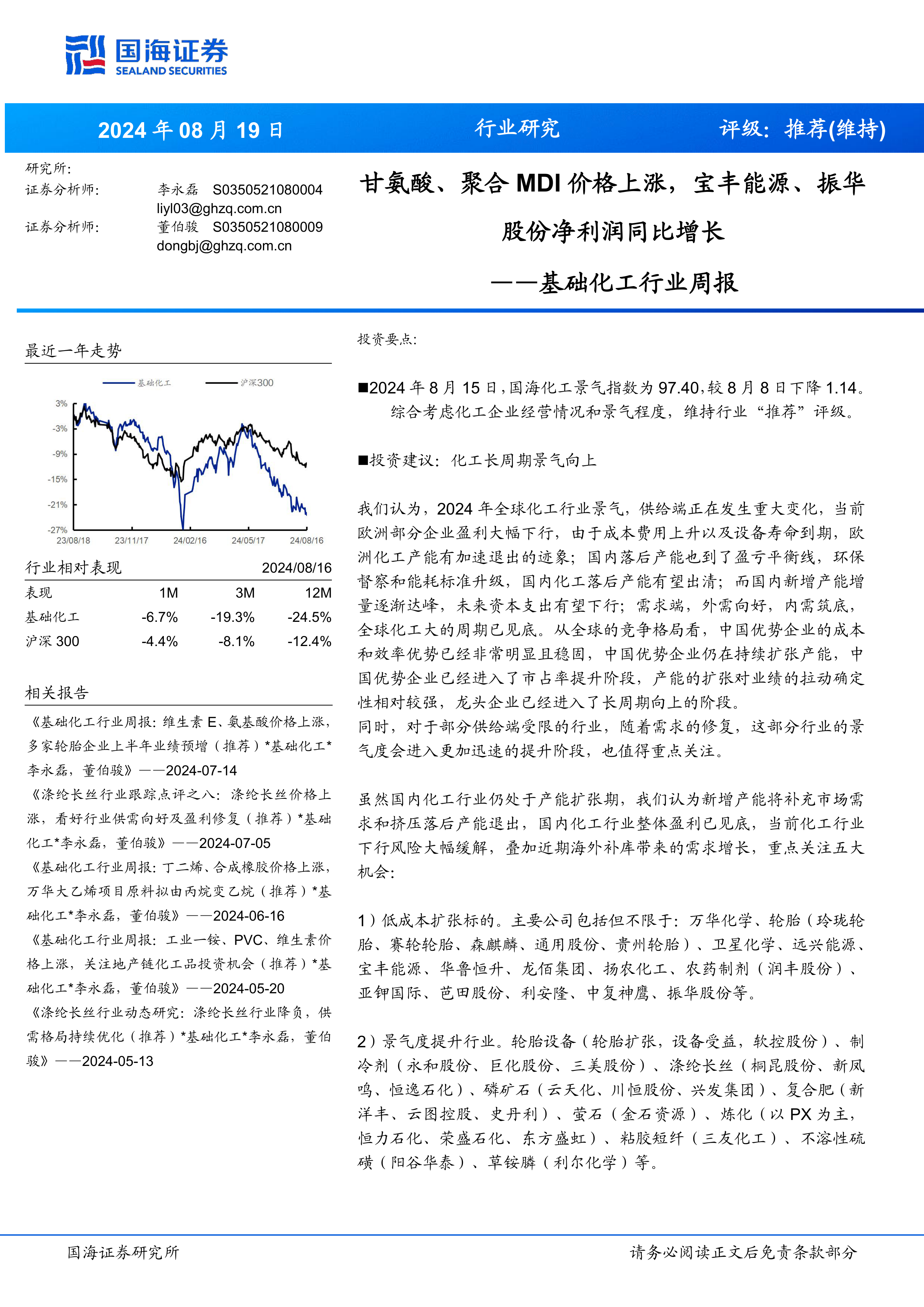 基础化工行业周报:甘氨酸、聚合MDI价格上涨,宝丰能源、振华股份净利润同比增长