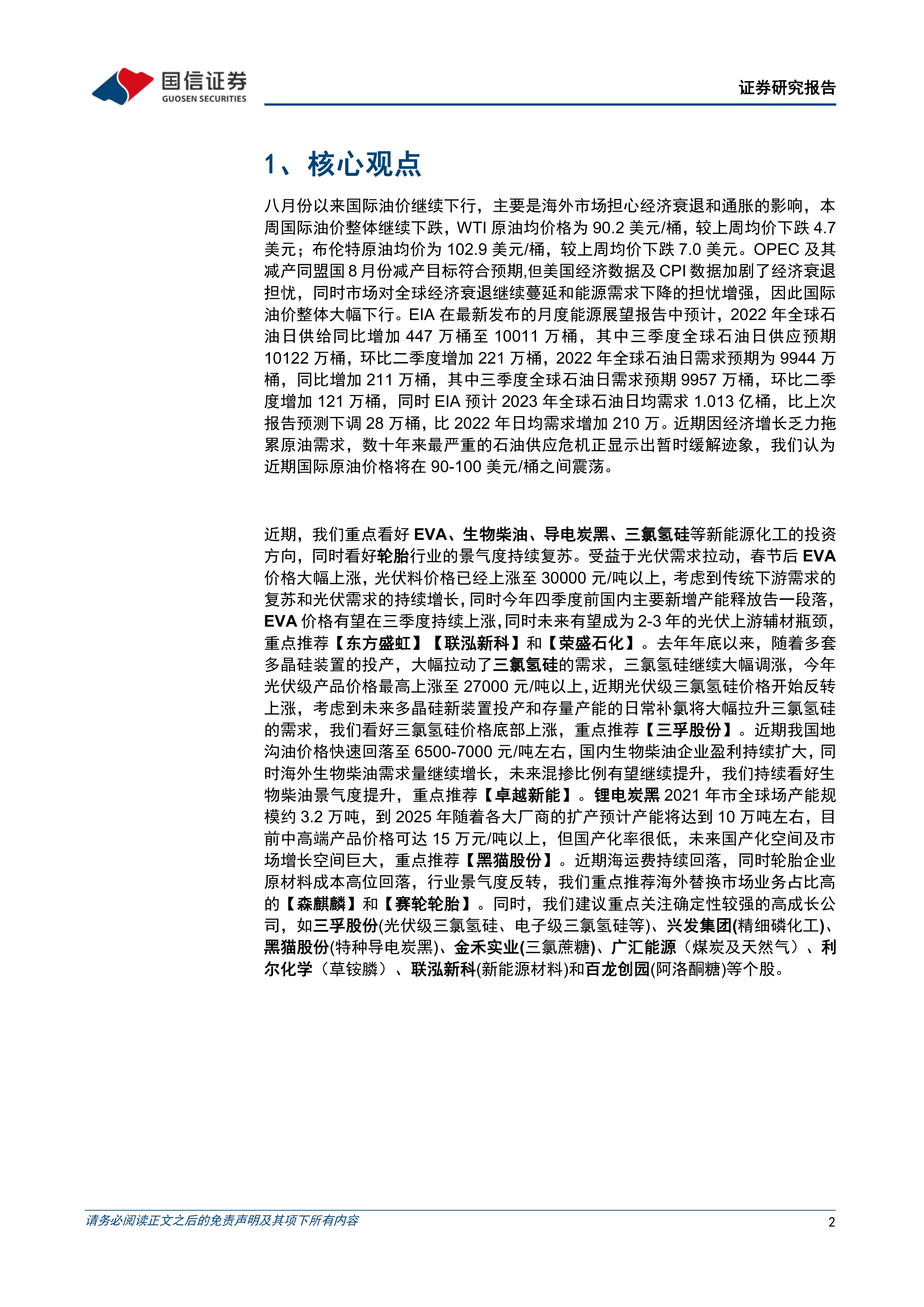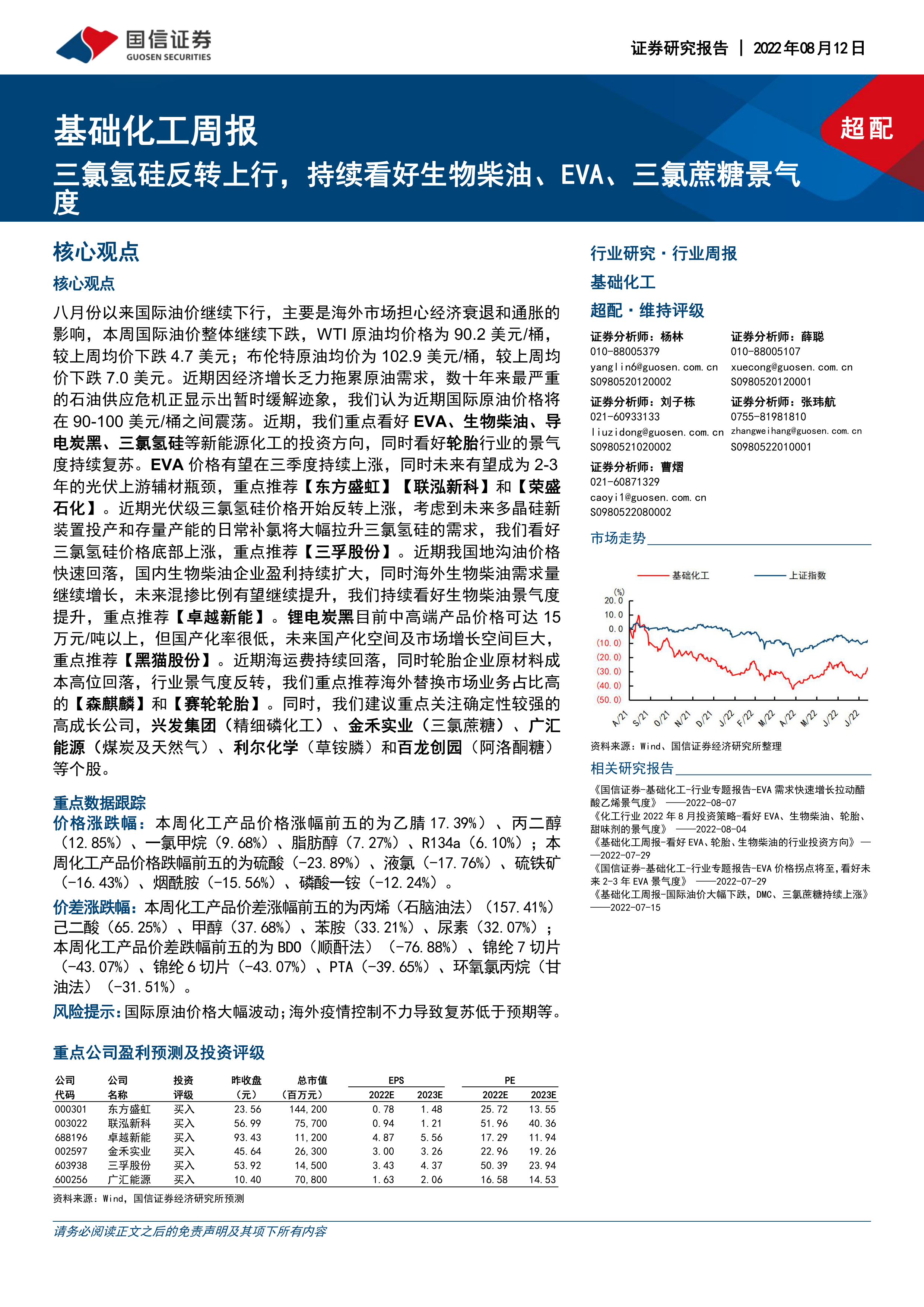 八月份以来国际油价继续下行,主要是海外市场担心经济衰退和通胀的影响,本周国际油价整体继续下跌,WTI原油均价格为90.2美元/桶,较上周均价下跌4.7美元;布伦特原油均价为102.9美元/桶,较上周均价下跌7.0美元。近期因经济增长乏力拖累原油需求,数十年来最严重的石油供应危机正显示出暂时缓解迹象,我们认为近期国际原油价格将在90-100美元/桶之间震荡。近期,我们重点看好EVA、生物柴油、导电炭黑、三氯氢硅等新能源化工的投资方向,同时看好轮胎行业的景气度持续复苏。EVA价格有望在三季度持续上涨,同时未来有望成为2-3年的光伏上游辅材瓶颈,重点推荐【东方盛虹】【联泓新科】和【荣盛石化】。近期光伏级三氯氢硅价格开始反转上涨,考虑到未来多晶硅新装置投产和存量产能的日常补氯将大幅拉升三氯氢硅的需求,我们看好三氯氢硅价格底部上涨,重点推荐【三孚股份】。近期我国地沟油价格快速回落,国内生物柴油企业盈利持续扩大,同时海外生物柴油需求量继续增长,未来混掺比例有望继续提升,我们持续看好生物柴油景气度提升,重点推荐【卓越新能】。锂电炭黑目前中高端产品价格可达15万元/吨以上,但国产化率很低,未来国产化空间及市场增长空间巨大,重点推荐【黑猫股份】。近期海运费持续回落,同时轮胎企业原材料成本高位回落,行业景气度反转,我们重点推荐海外替换市场业务占比高的【森麒麟】和【赛轮轮胎】。同时,我们建议重点关注确定性较强的高成长公司,兴发集团(精细磷化工)、金禾实业(三氯蔗糖)、广汇能源(煤炭及天然气)、利尔化学(草铵膦)和百龙创园(阿洛酮糖)等个股。
