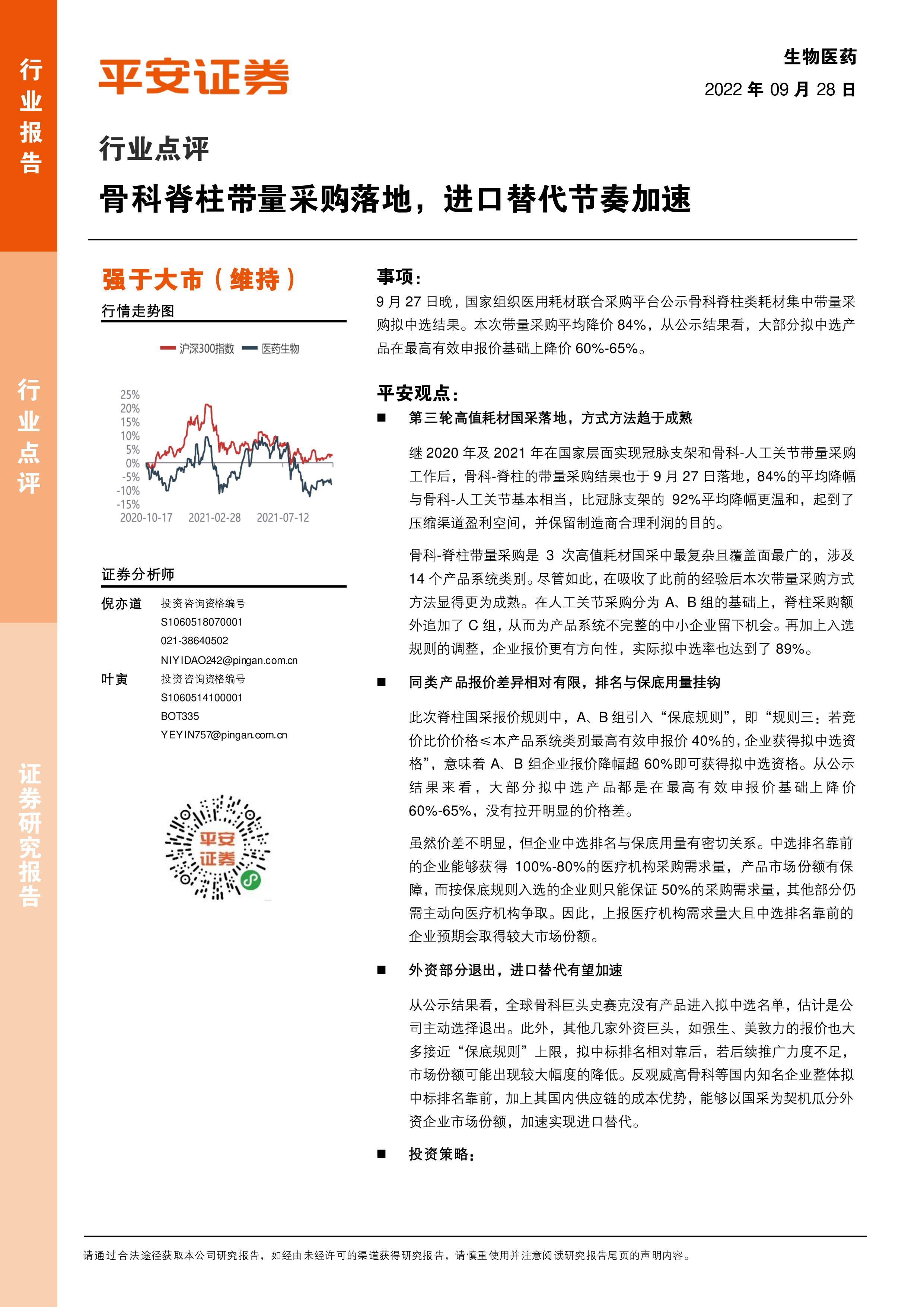 生物医药行业点评:骨科脊柱带量采购落地,进口替代节奏加速