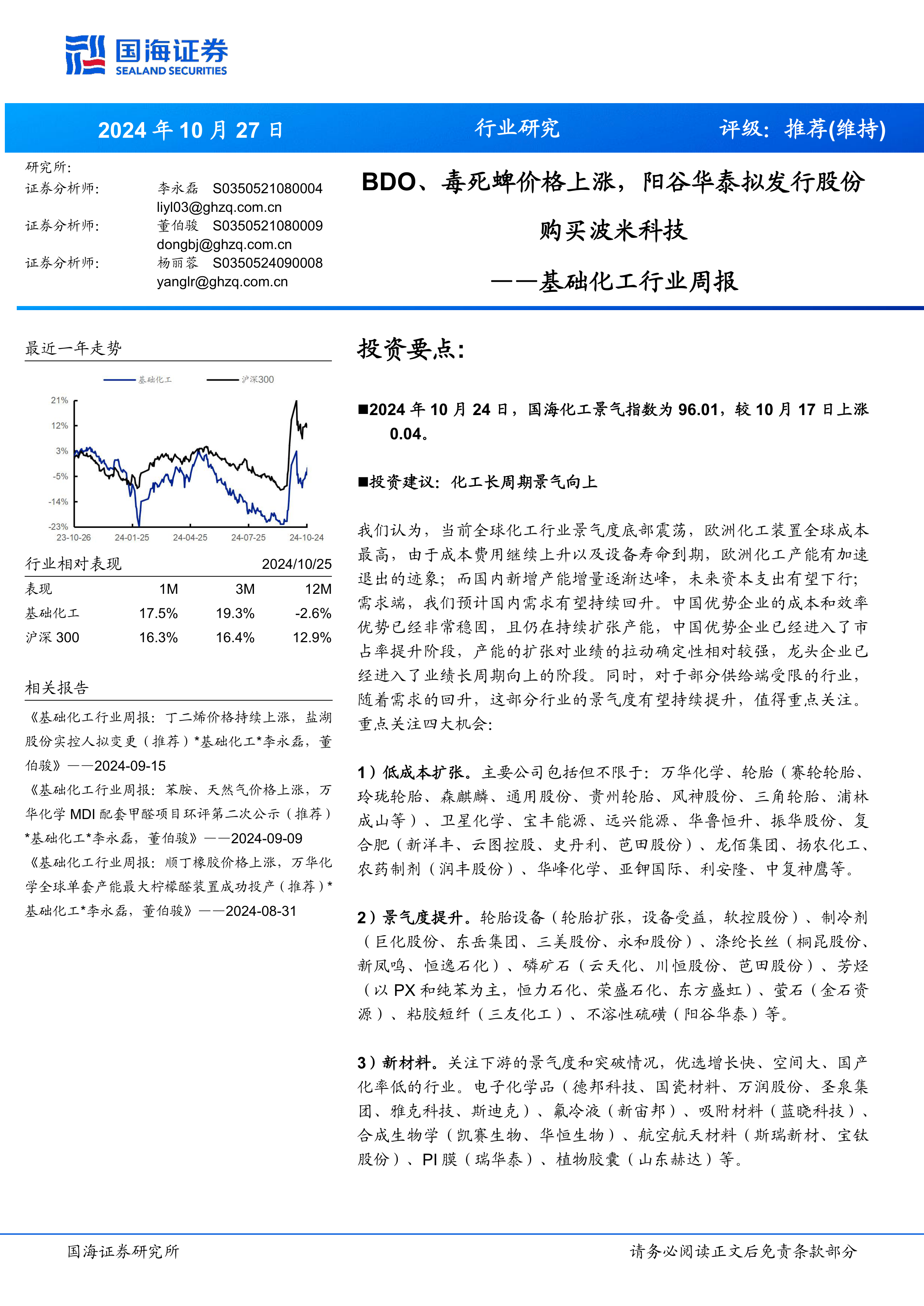 基础化工行业周报:BDO、毒死蜱价格上涨,阳谷华泰拟发行股份购买波米科技