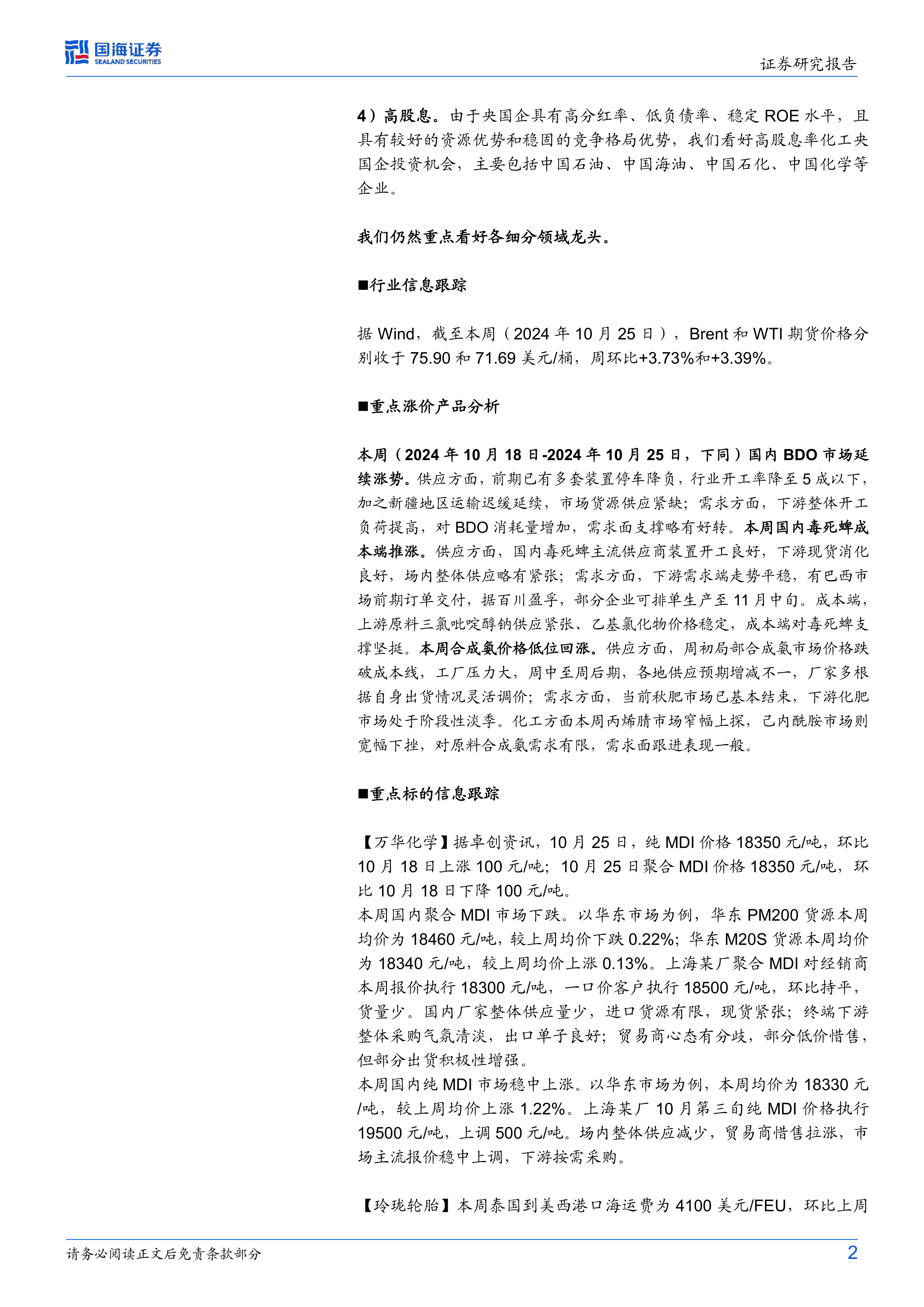 高股息: 看好高分红率、低负债率、稳定ROE水平的化工央国企,例如中国石油、中国海油、中国石化、中国化学等。这些企业具有较好的资源优势和稳固的竞争格局,是稳健投资的选择。
