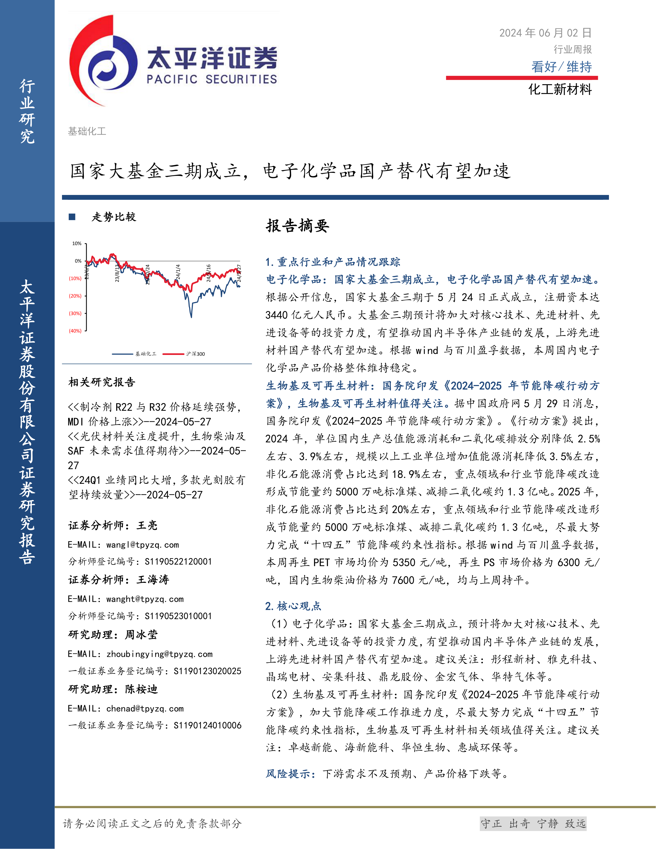本报告对2024年6月2日化工新材料行业进行了周度分析。国家大基金三期的成立将有力推动电子化学品国产化进程,而节能降碳政策的实施则为生物基及可再生材料行业发展提供了有利条件。报告对重点化工品价格、细分领域市场表现以及相关政策进行了深入分析,并对部分重点公司进行了跟踪,为投资者提供了有价值的参考信息。 需要注意的是,报告中提到的投资建议仅供参考,不构成投资建议,投资者需根据自身情况进行独立判断。 未来需持续关注下游需求变化、产品价格波动以及相关政策调整对行业的影响。