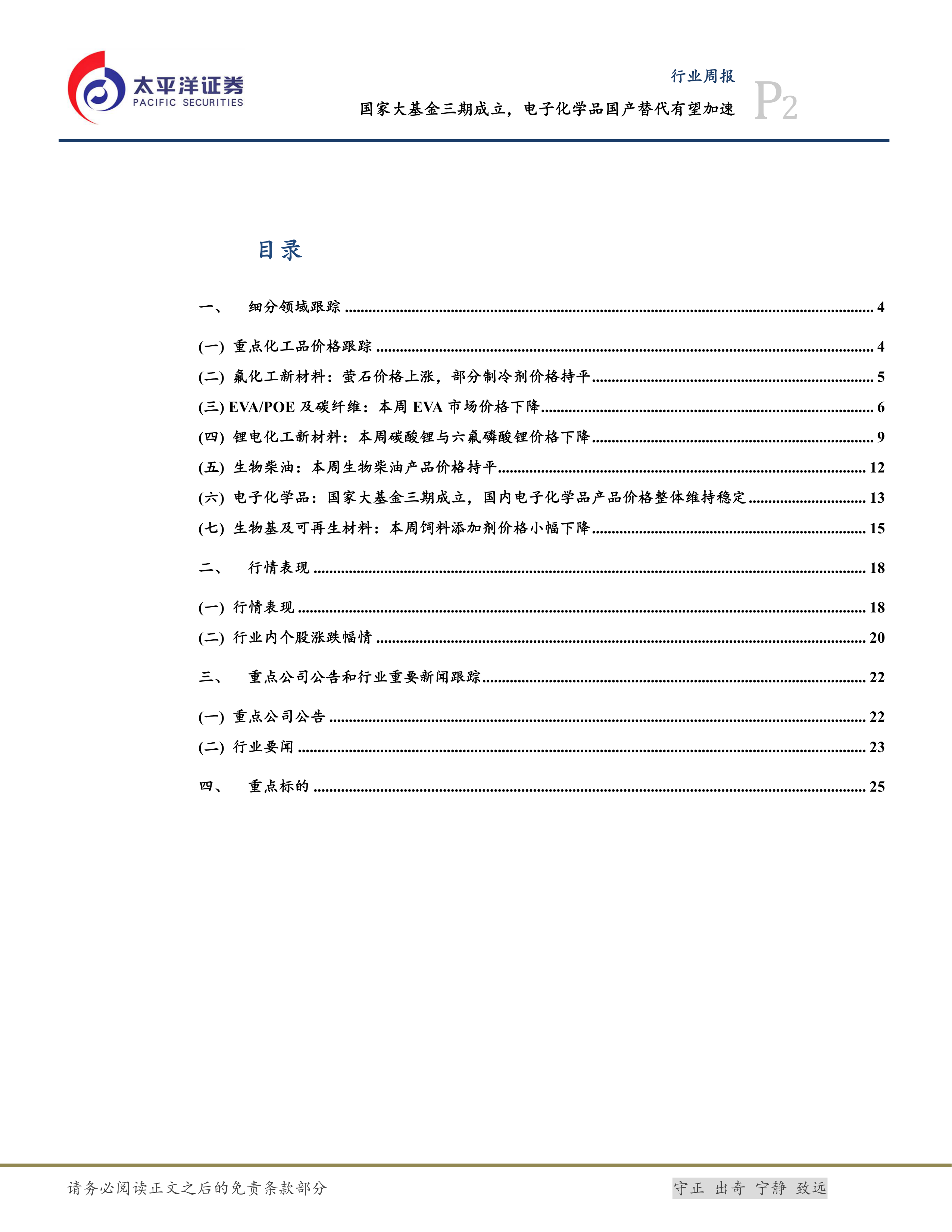 本部分对重点化工品价格、氟化工新材料、EVA/POE及碳纤维、锂电化工新材料、生物柴油、电子化学品以及生物基及可再生材料等细分领域进行了跟踪分析,并提供了相应的图表数据支持。
