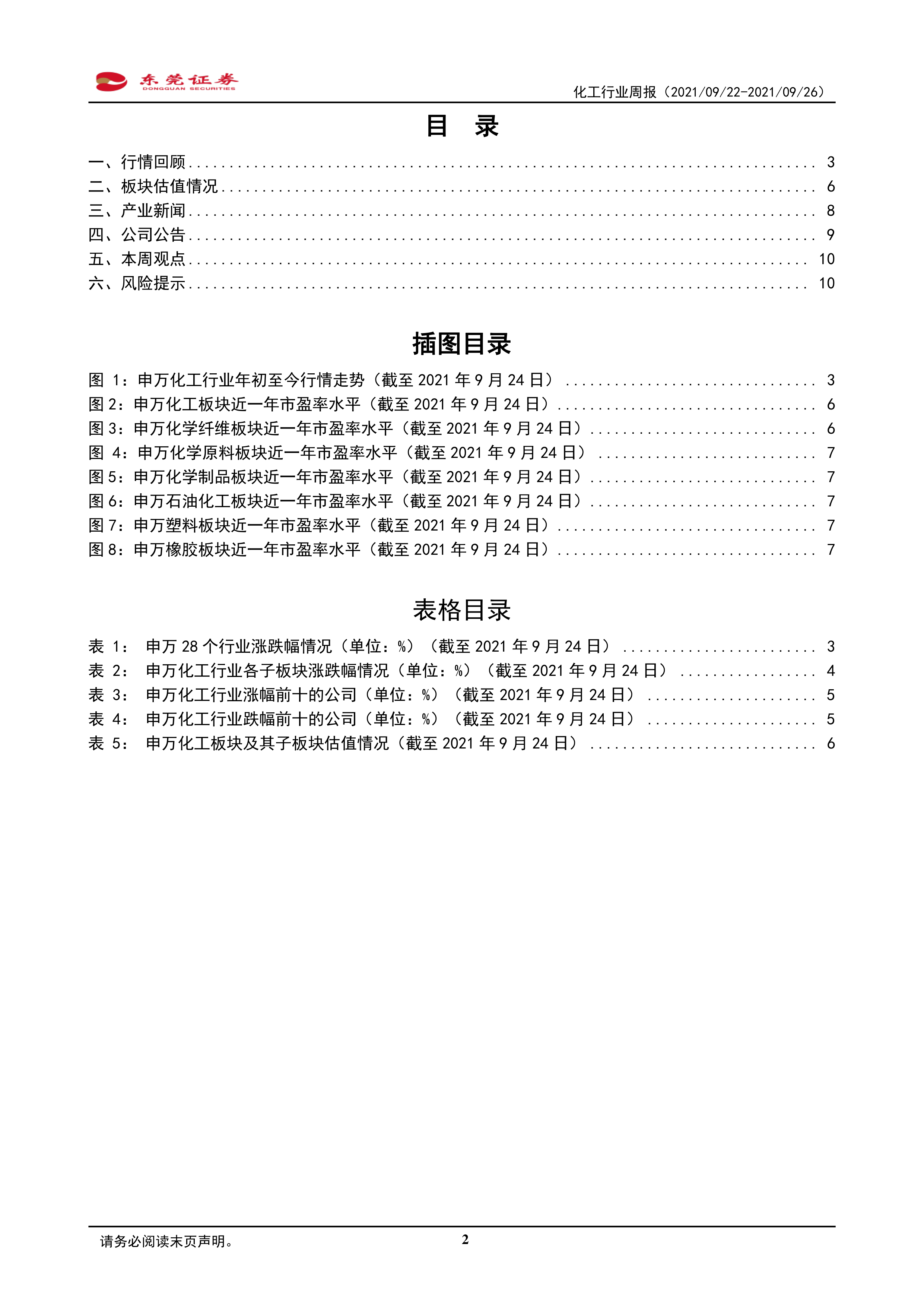 本报告对2021年9月22日至26日期间化工行业的市场表现、产业政策、公司动态以及未来发展趋势进行了全面分析。短期内,限电限产政策对化工行业造成冲击,导致行业指数下跌,部分个股跌幅显著。然而,长期来看,国家对新能源产业的支持以及碳中和目标的提出,为新能源相关化工细分领域带来了发展机遇。报告建议投资者关注新能源产业链上游原材料生产企业,并选择具有竞争优势、抗风险能力强的公司进行投资,同时需密切关注政策变化和市场风险。 报告中提供的统计数据和图表,为投资者提供了更直观的市场信息和分析依据。