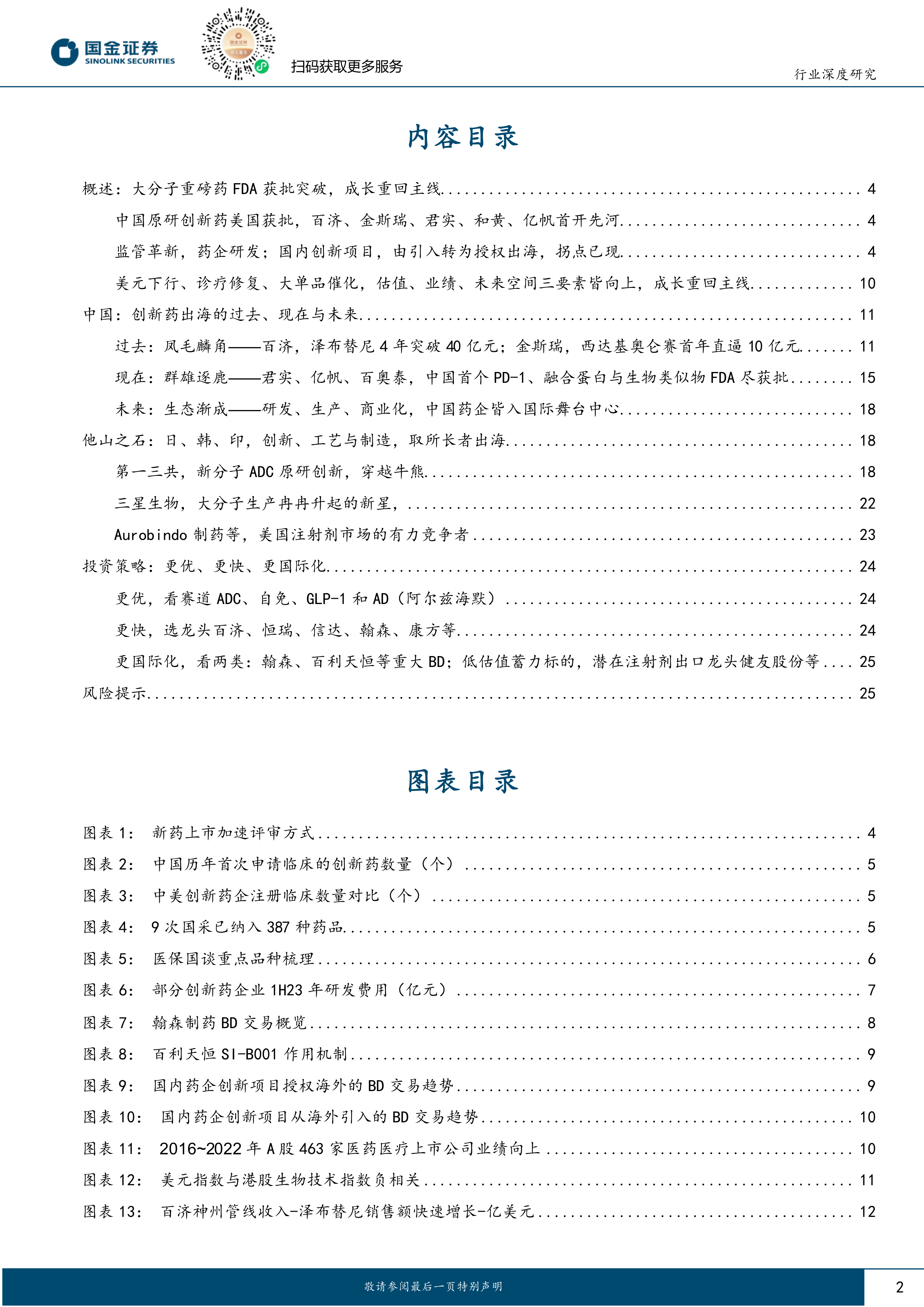 结论:大分子重磅药FDA获批突破,成长重回主线。(1)中国原研创新药美国获批,百济、金斯瑞、君实、和黄、亿帆首开先河。从医药行业本身的进步来看,2023年,是中国创新药出海突破的元年。随着中国首个创新药大分子,君实生物的PD-1特瑞普利单抗,于2023年10月在美国食药监局(FDA)获批上市,中国药企大分子重磅出海成功的序幕开启。中国医药行业的成长空间自此又跨出一大步,从低端原料药、高端注射剂、小分子创新药再到大分子生物创新药,都步入了全球主要医药市场。(2)监管革新,药企研发;国内创新项目,由引入转为授权出海,拐点已现。从监管、支付和研发投入的角度来看,国家新药审批提速、国谈集采降费降费过千亿、国内药企研发投入持续;因此,创新成果倍出,中国药企的全球合作(BD交易)从引入转为授权出海为主,药企出海拐点已现。(3)美元下行、诊疗修复、大单品催化,估值、业绩、未来空间三要素皆向上,成长重回主线。创新药板块的刚需与强成长属性,决定了中长期业绩向上的确定性和单品驱动爆发式成长性的高弹性。但是此前,整个板块遭遇三大制约因素:地缘风险对订单预期的打压、国谈集采降价对单品销售峰值的挤压、出海不确定性对成长空间的局限;如前所述,目前这三大医药创新领域的制约因素,皆已破局。