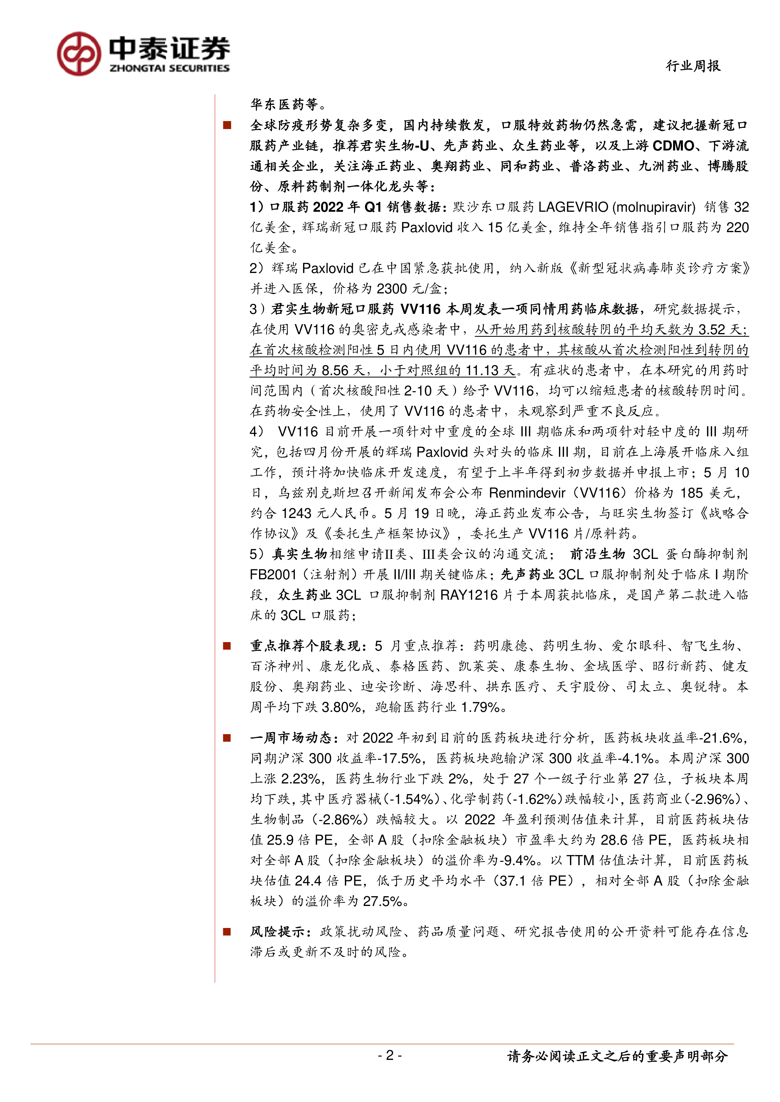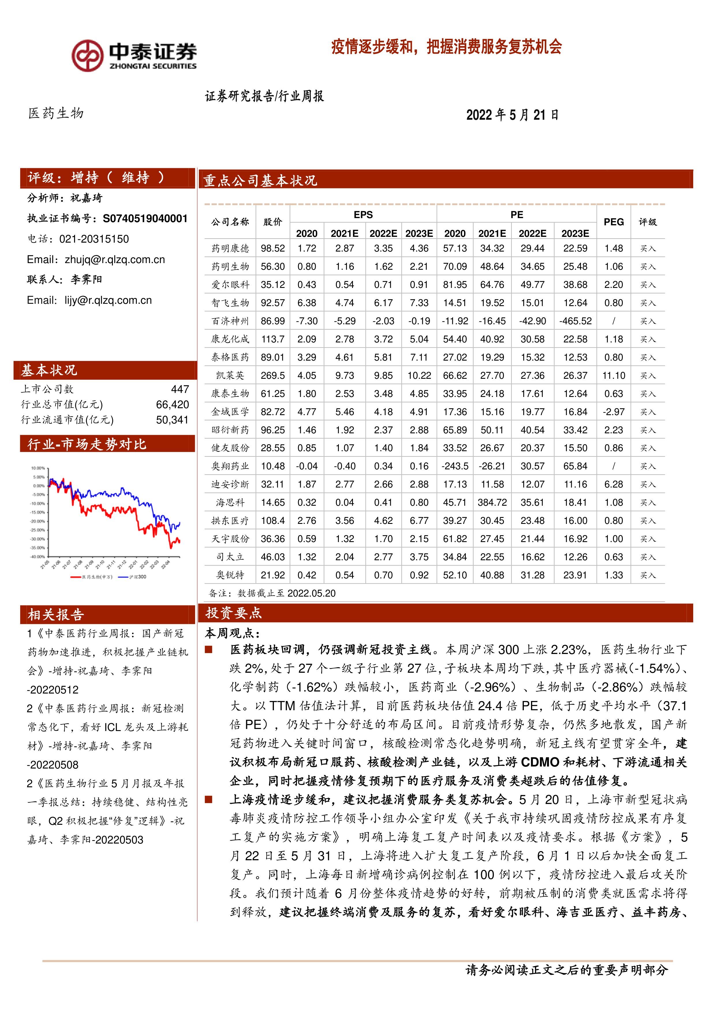 本报告的核心观点是:在疫情逐步缓和的背景下,医药生物行业面临着消费服务复苏和新冠药物持续需求的双重机遇。报告建议投资者积极把握新冠口服药、核酸检测产业链以及上游CDMO和耗材、下游流通相关企业的投资机会,同时关注疫情修复预期下医疗服务及消费类超跌股的估值修复。