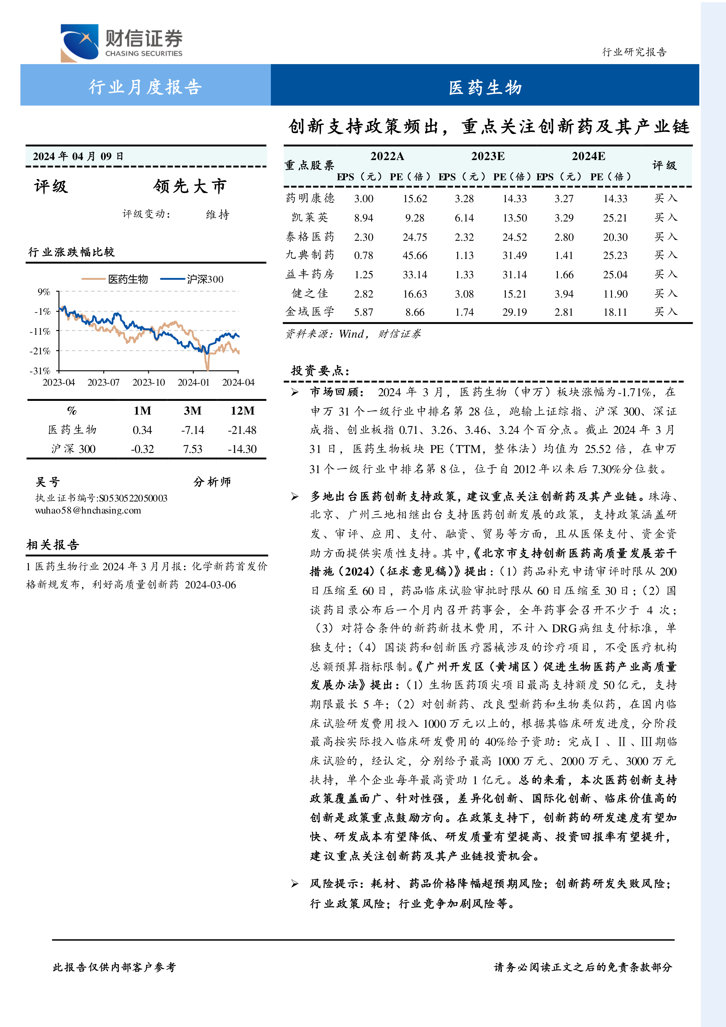 本报告对2024年3月医药生物板块的市场表现、行业估值以及重要公司动态进行了全面分析。尽管3月份板块整体表现疲软,但多地出台的创新药支持政策为行业发展带来积极信号。报告建议投资者重点关注创新药及其产业链的投资机会,并对不同细分领域的投资方向提出了具体建议。 投资者需注意报告中提到的风险提示,谨慎决策。