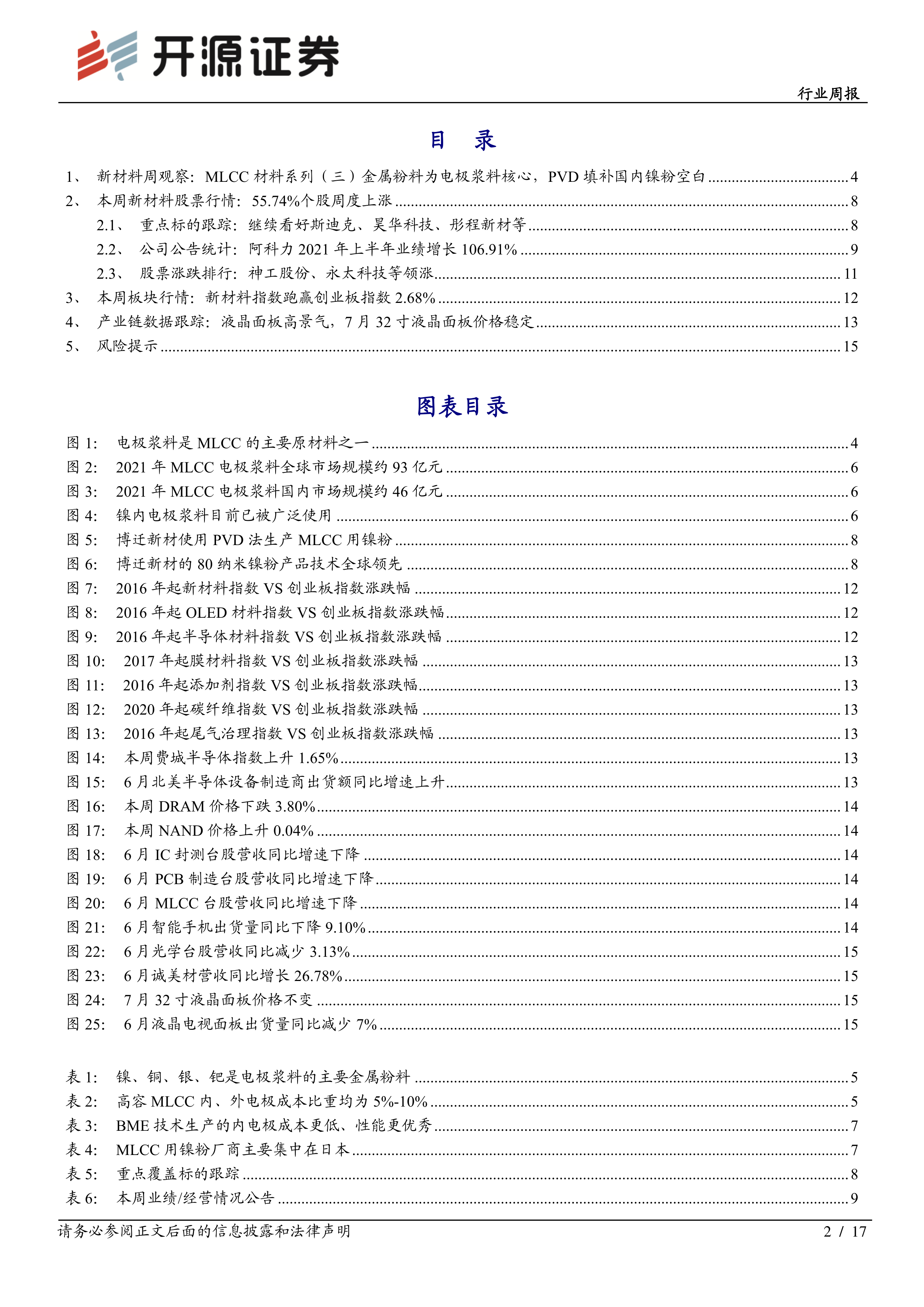 本报告通过对MLCC电极浆料市场规模、金属粉料特性、博迁新材PVD技术等方面的分析,指出MLCC电极浆料市场前景广阔,而博迁新材凭借其自主研发的PVD技术,有望在国内外市场占据领先地位。报告还对本周新材料行业股票行情、板块行情以及产业链数据进行了跟踪和分析,为投资者提供了较为全面的市场信息。 然而,报告也提示了技术突破不及预期、行业竞争加剧、原材料价格波动等风险因素。投资者需谨慎决策。