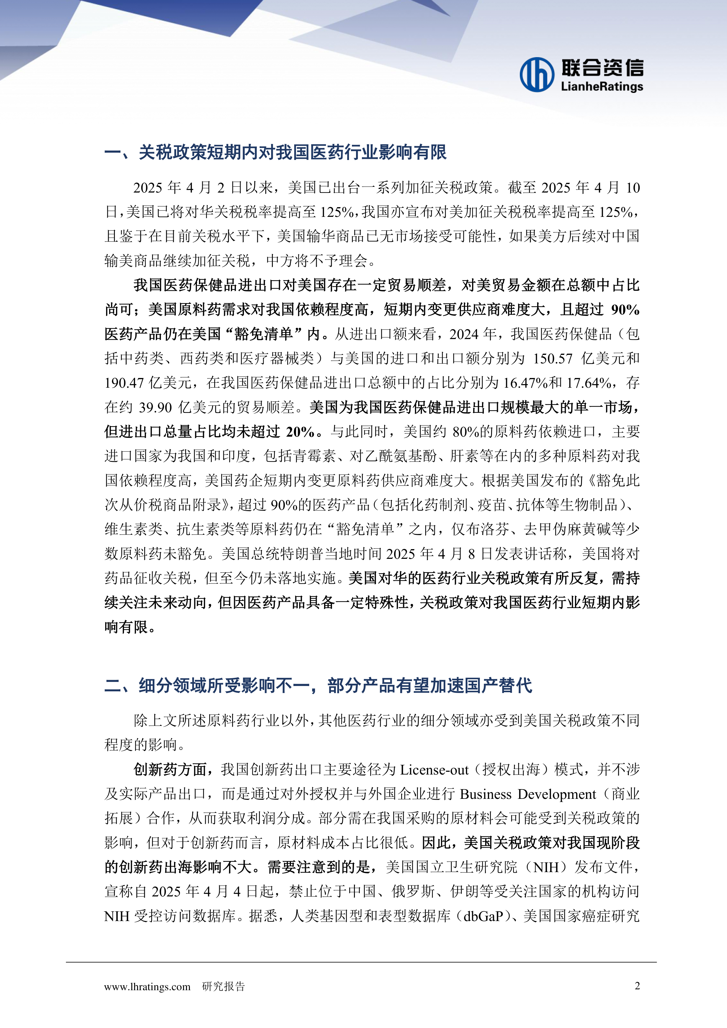 本节主要分析了美国对华加征关税政策对我国医药行业短期影响有限的原因。通过数据显示,我国医药保健品对美贸易存在顺差,美国对我国原料药存在高度依赖,且大部分医药产品被列入美国“豁免清单”,这些因素共同导致关税政策对我国医药行业整体影响较小。 报告中详细列举了2024年我国医药保健品与美国的进出口额数据,并分析了美国原料药进口依赖情况,以及“豁免清单”对不同医药产品的覆盖范围。