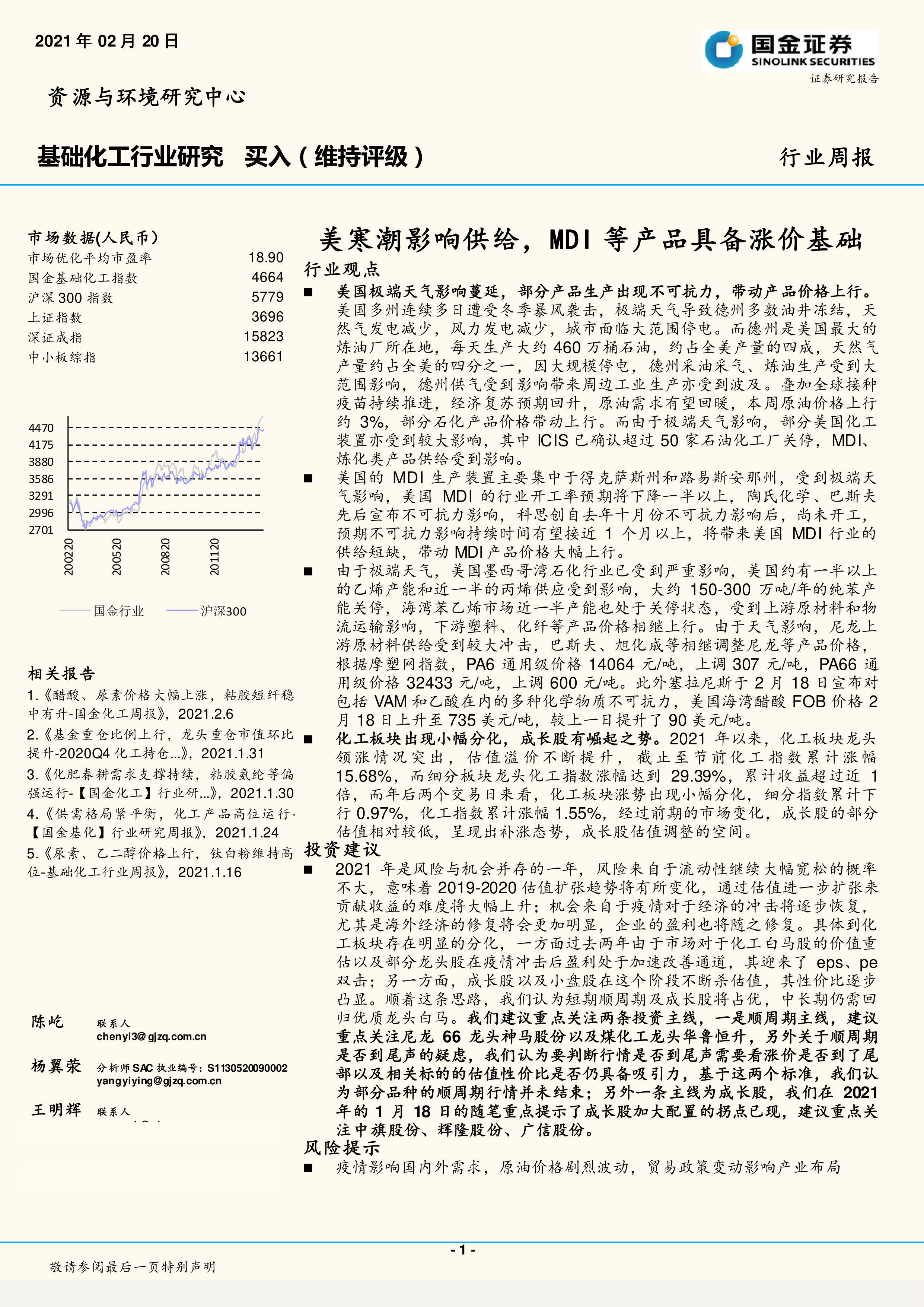 基础化工行业研究:美寒潮影响供给,MDI等产品具备涨价基础