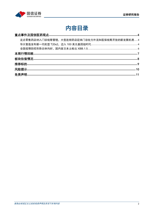 本报告分析了本周医药生物行业的表现,重点关注了定点零售药店纳入门诊统筹管理政策以及华大智造发布新一代测序仪这两项重大事件。 政策变化将深刻影响医药零售行业格局,利好大型连锁药店;而华大智造的突破性技术则有望加速基因测序行业的应用和发展。报告最后对多家医药公司进行了投资评级和推荐,为投资者提供了参考依据。 然而,投资者需注意报告中提到的风险提示,例如疫情反复、医保控费和集采等因素可能对行业和公司业绩造成影响。 投资者应根据自身情况谨慎决策。