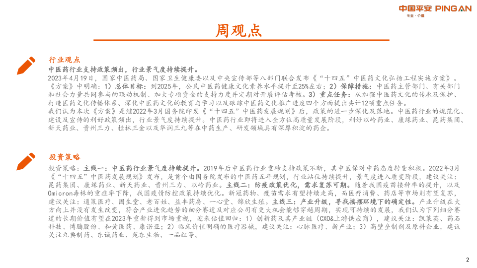 本报告的核心观点围绕中医药行业展开,认为其景气度持续提升,主要基于以下两点: