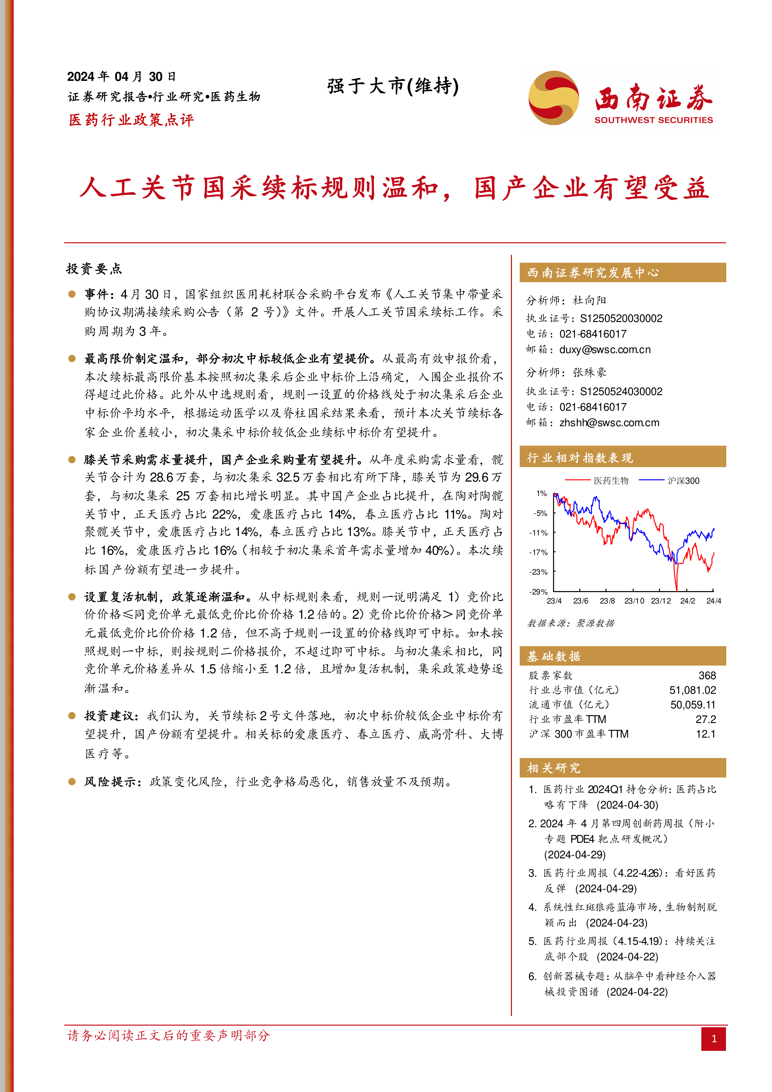 本报告的核心观点是:人工关节国家组织集中带量采购(国采)续标规则相对温和,为国产企业提供了进一步提升市场份额的机会。续标最高限价基本维持在初次集采企业中标价上沿,部分初次中标价较低的企业有望提价;膝关节采购需求量显著提升,利好国产企业;此外,政策中设置的“复活机制”也体现了政策的温和趋势。