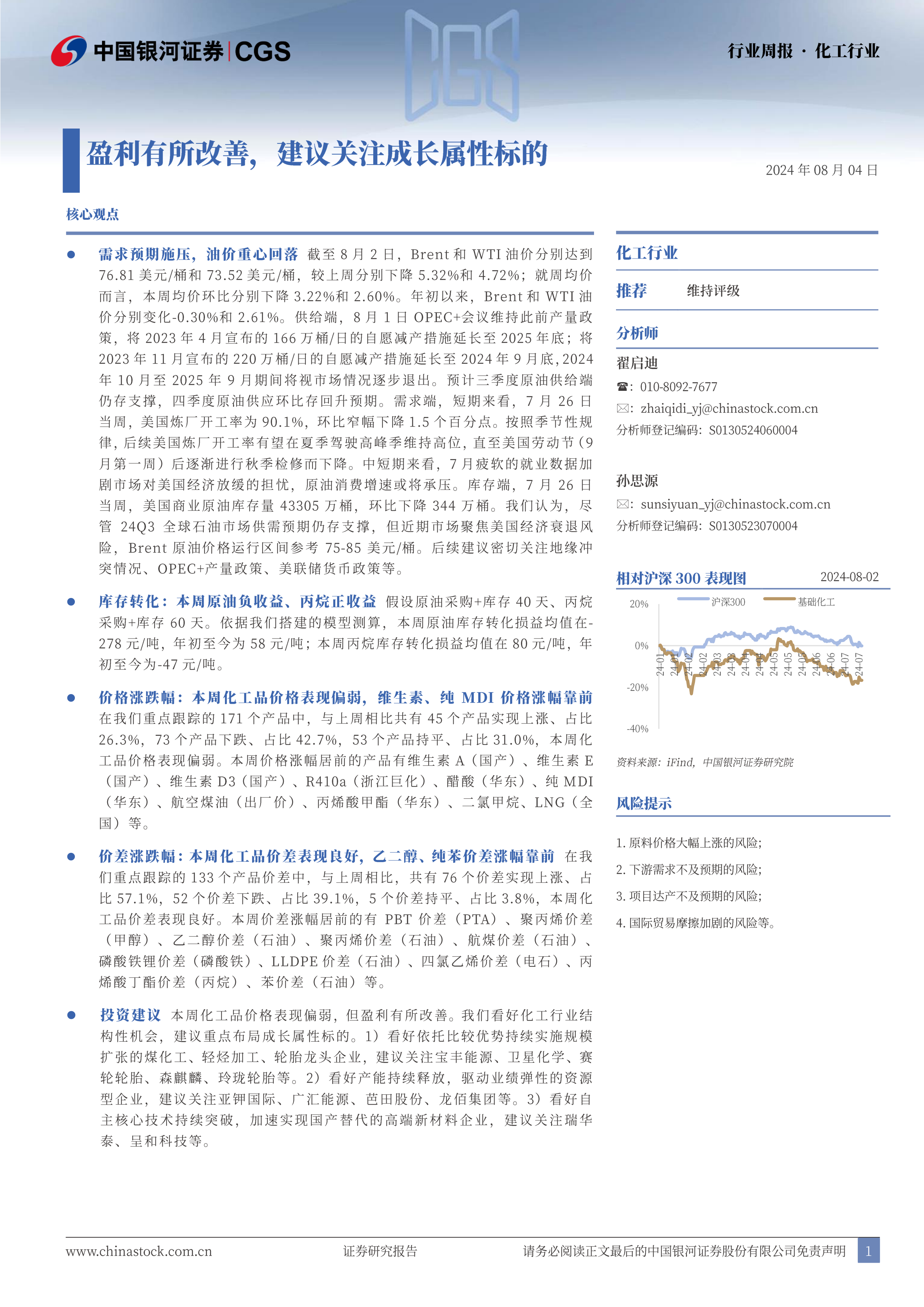 投资建议本周化工品价格表现偏弱,但盈利有所改善。我们看好化工行业结构性机会,建议重点布局成长属性标的。1)看好依托比较优势持续实施规模扩张的煤化工、轻泾加工、轮胎龙头企业,建议关注宝丰能源、卫星化学、赛轮轮胎、森麒麟、玲珑轮胎等。2)看好产能持续释放,驱动业绩弹性的资源型企业,建议关注亚钾国际、广汇能源、芭田股份、龙佰集团等。3)看好自主核心技术持续突破,加速实现国产替代的高端新材料企业,建议关注瑞华泰、呈和科技等。