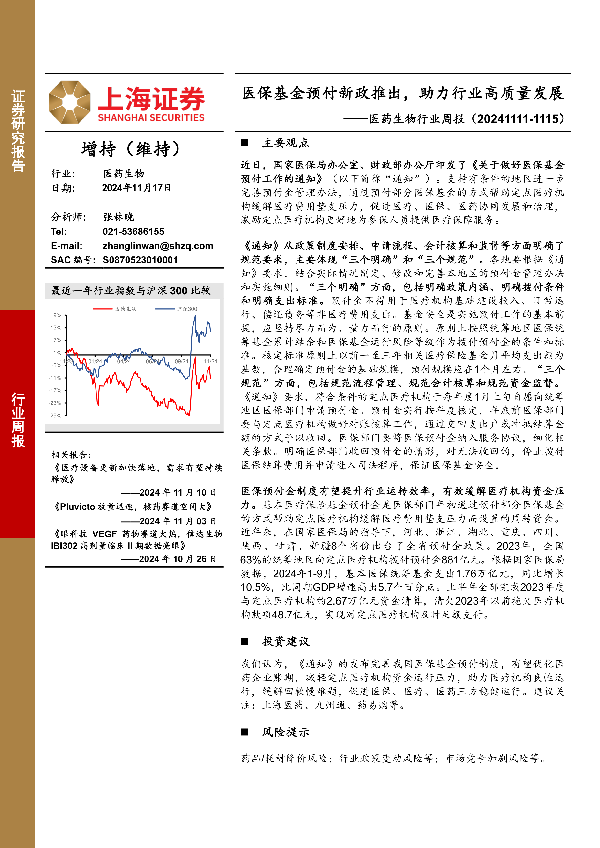 本报告主要围绕国家医保基金预付新政展开分析,内容涵盖政策解读、数据分析和投资建议等方面。