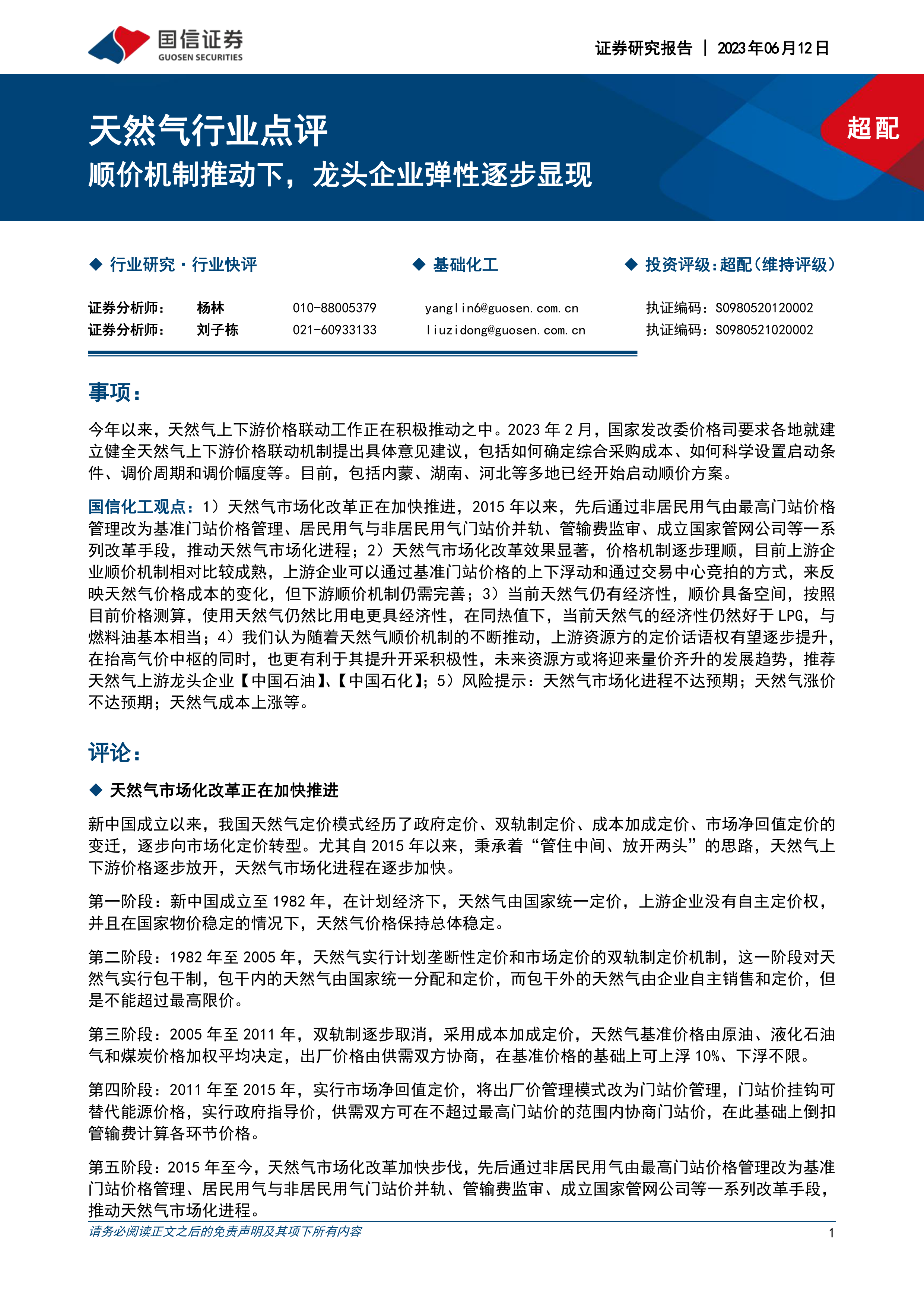 本报告的核心观点是:中国天然气市场化改革持续推进,顺价机制逐步完善,为上游龙头企业带来发展机遇。具体而言: