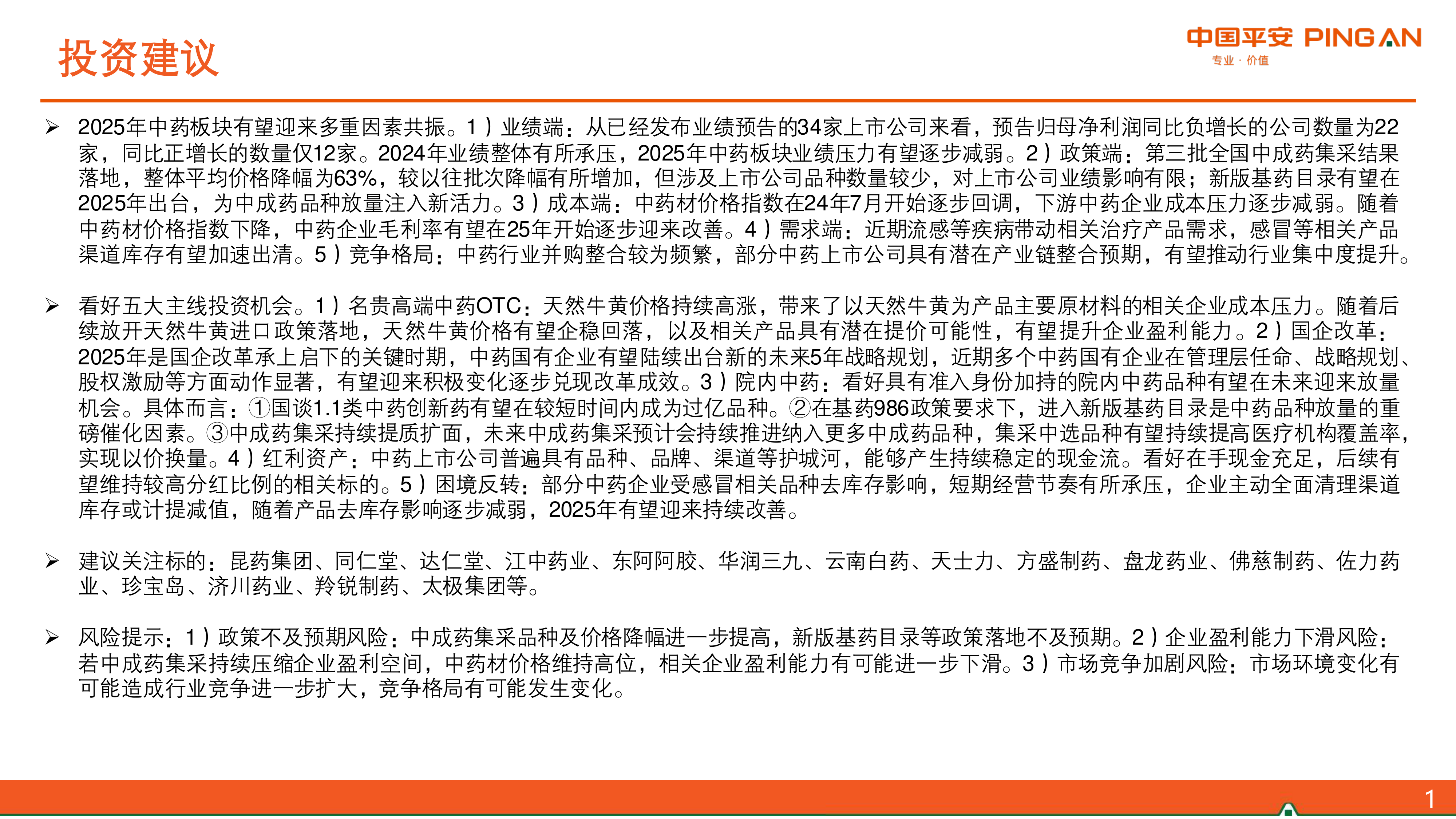 看好五大主线投资机会。1)名贵高端中药OTC:天然牛黄价格持续高涨,带来了以天然牛黄为产品主要原材料的相关企业成本压力。随着后续放开天然牛黄进口政策落地,天然牛黄价格有望企稳回落,以及相关产品具有潜在提价可能性,有望提升企业盈利能力。2)国企改革:2025年是国企改革承上启下的关键时期,中药国有企业有望陆续出台新的未来5年战略规划,近期多个中药国有企业在管理层任命、战略规划、股权激励等方面动作显著,有望迎来积极变化逐步兑现改革成效。3)院内中药:看好具有准入身份加持的院内中药品种有望在未来迎来放量机会。具体而言:①国谈1.1类中药创新药有望在较短时间内成为过亿品种。②在基药986政策要求下,进入新版基药目录是中药品种放量的重磅催化因素。③中成药集采持续提质扩面,未来中成药集采预计会持续推进纳入更多中成药品种,集采中选品种有望持续提高医疗机构覆盖率,实现以价换量。4)红利资产:中药上市公司普遍具有品种、品牌、渠道等护城河,能够产生持续稳定的现金流。看好在手现金充足,后续有望维持较高分红比例的相关标的。5)困境反转:部分中药企业受感冒相关品种去库存影响,短期经营节奏有所承压,企业主动全面清理渠道库存或计提减值,随着产品去库存影响逐步减弱,2025年有望迎来持续改善。