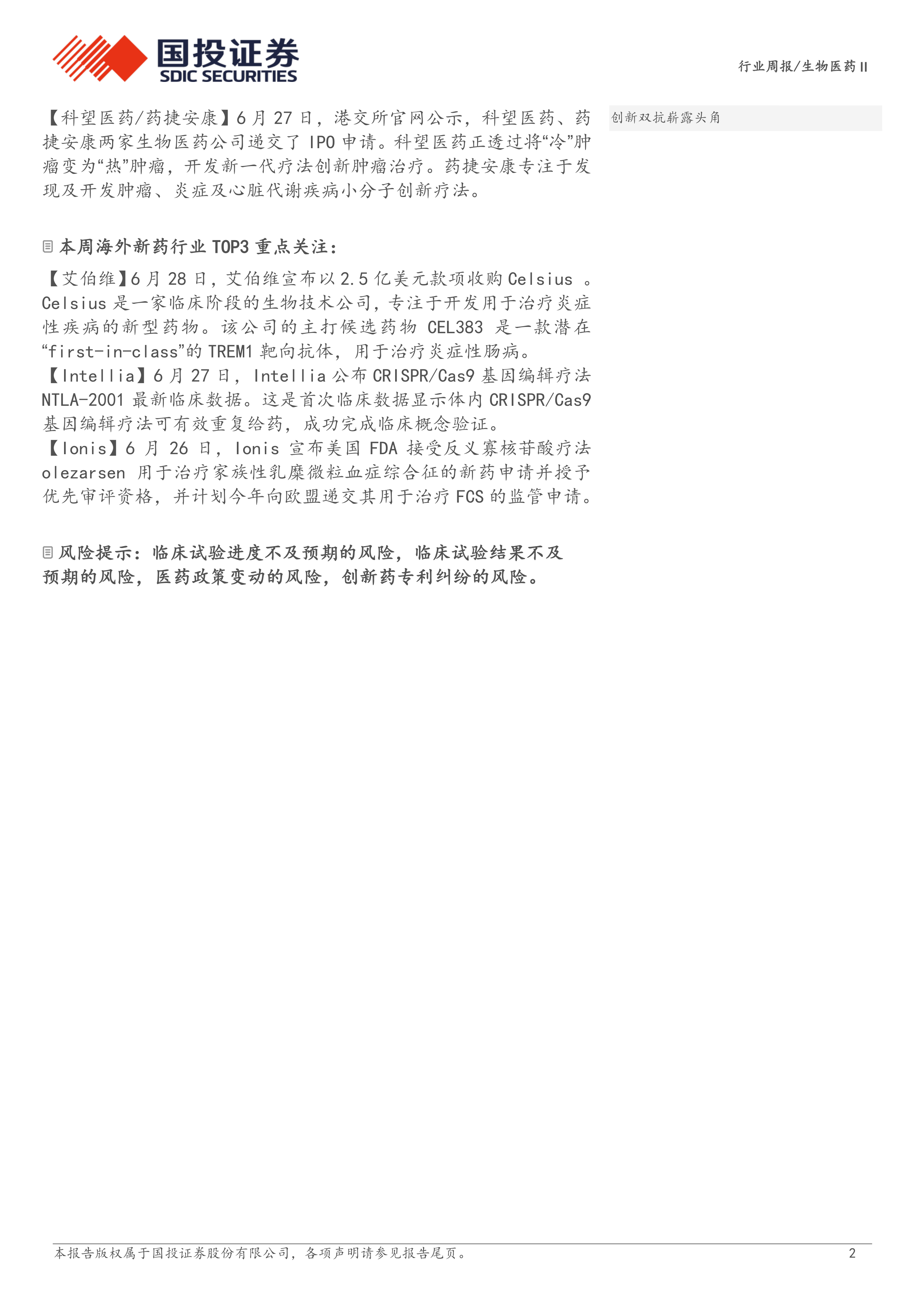 【百奥泰】6月28日,中国国家药品监督管理局官网公示,1类新药枸橼酸倍维巴肽注射液上市申请已获批,是百奥泰生物针对心血管疾病领域核心产品之一,用于经皮冠状动脉介入围术期抗血栓治疗。【百济神州】6月28日,中国国家药品监督管理局官网公示,百济神州PD-1抑制剂替雷利珠单抗新适应症上市申请已获批,此次获批适应症:联合依托泊苷和铂类化疗用于一线治疗广泛期小细胞肺癌。【科望医药/药捷安康】6月27日,港交所官网公示,科望医药、药捷安康两家生物医药公司递交了IPO申请。科望医药正透过将“冷”肿瘤变为“热”肿瘤,开发新一代疗法创新肿瘤治疗。药捷安康专注于发现及开发肿瘤、炎症及心脏代谢疾病小分子创新疗法。