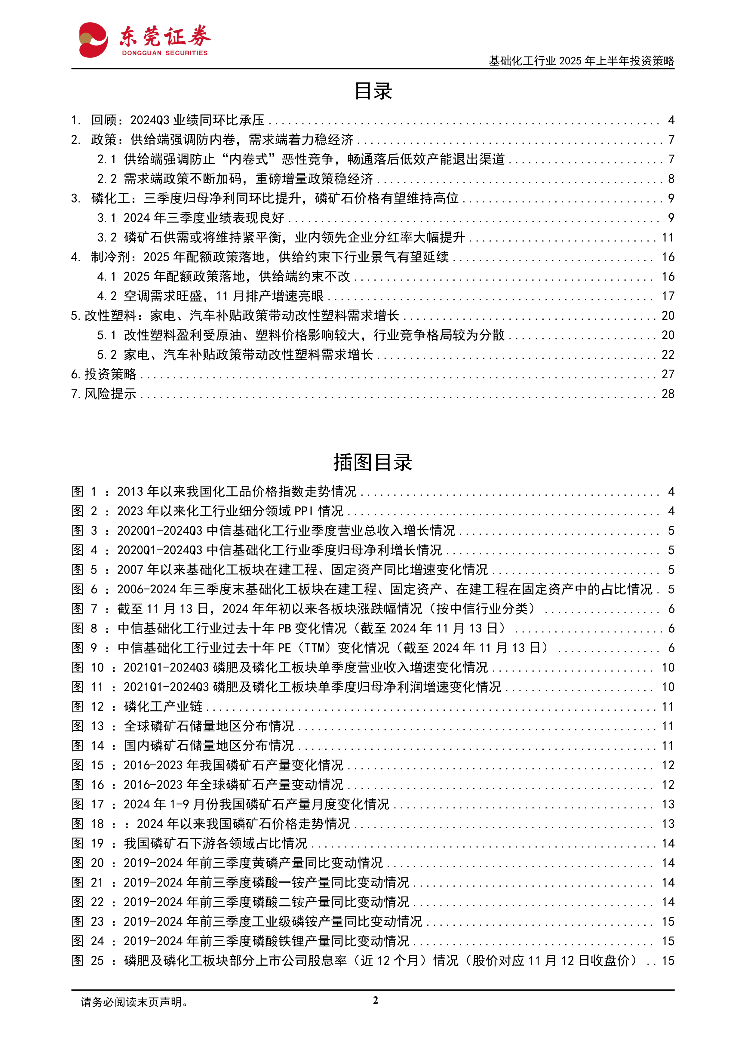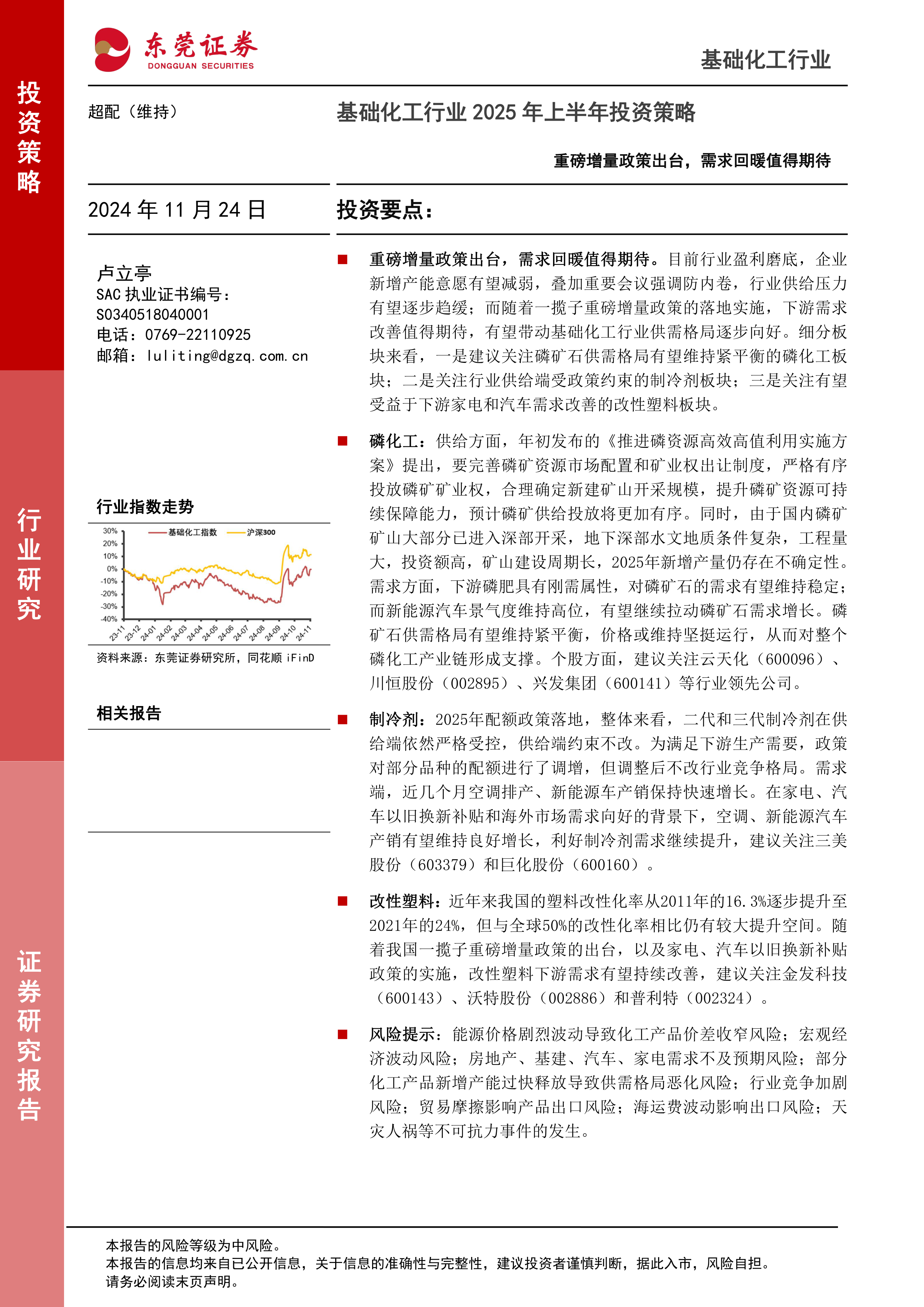本报告基于公开数据,对基础化工行业2025年上半年投资策略进行了分析。 报告认为,在供给侧结构性优化和需求侧政策刺激的共同作用下,基础化工行业整体向好,但仍需关注上游原材料价格波动、宏观经济环境变化以及下游需求不及预期等风险。 报告重点推荐磷化工、制冷剂和改性塑料三个细分板块,并对相关上市公司进行了投资建议。 投资者需谨慎判断,据此入市,风险自担。