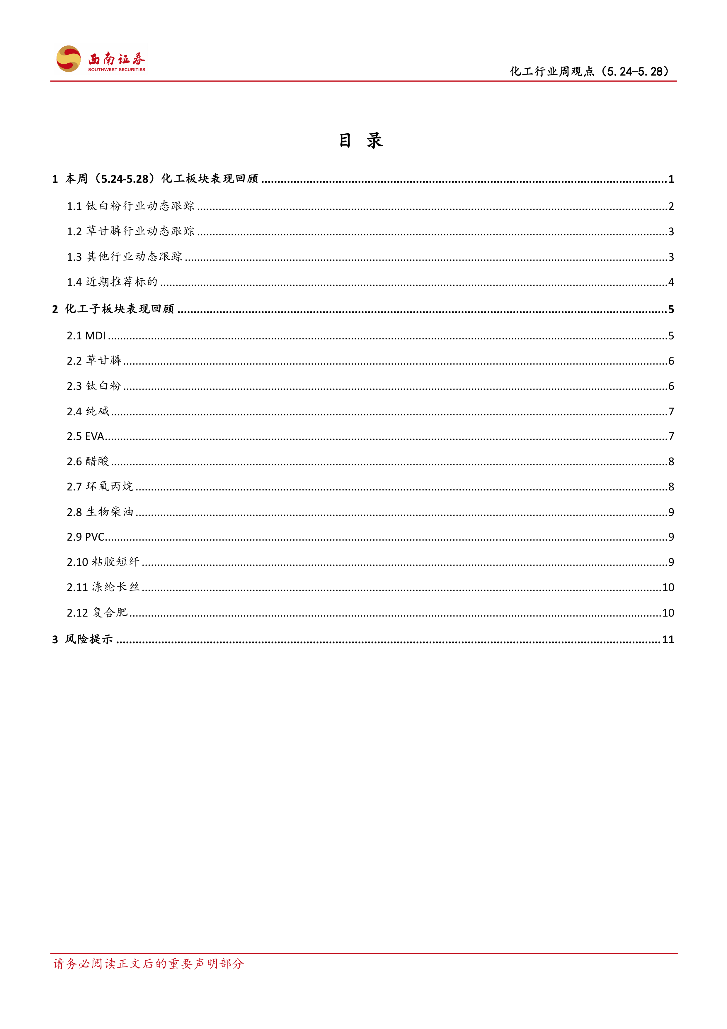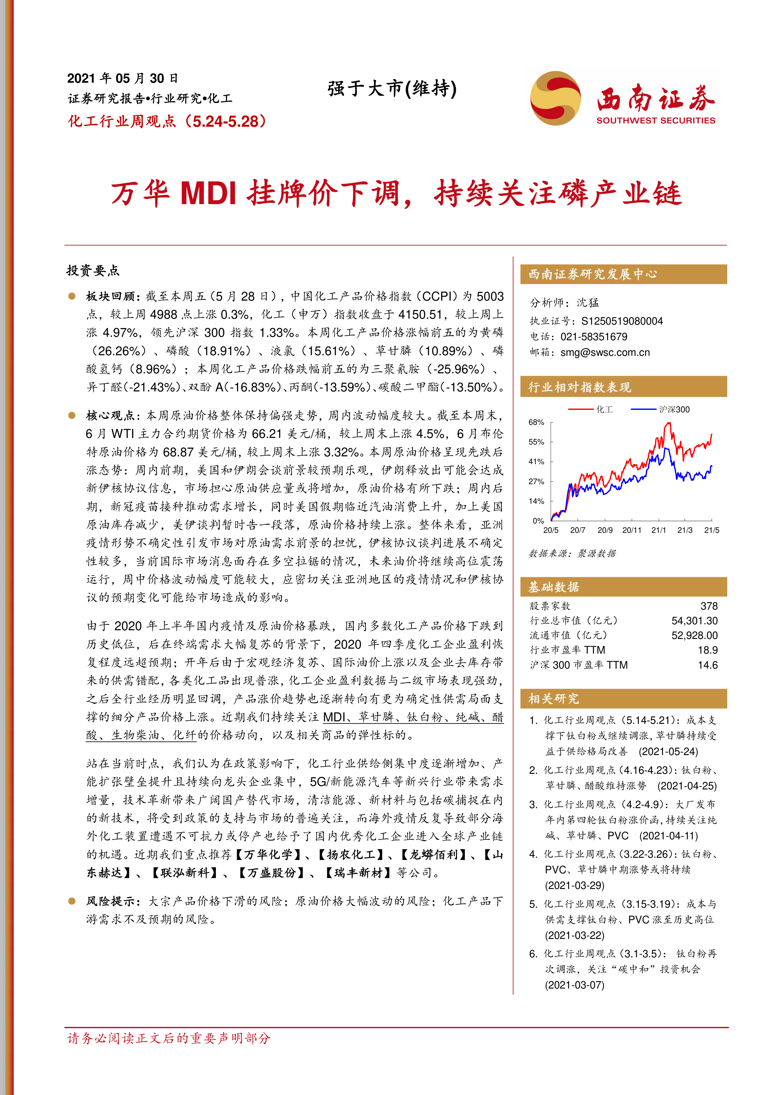 本报告的核心观点是:本周化工板块表现强于大市,主要受原油价格上涨和部分化工产品供需错配的影响。磷产业链、钛白粉、草甘膦等细分领域表现突出,但MDI价格有所回调。整体来看,化工行业供给侧集中度提升,龙头企业受益于新兴行业需求增长和国产替代,未来发展前景向好,但仍需关注大宗商品价格波动和下游需求变化的风险。