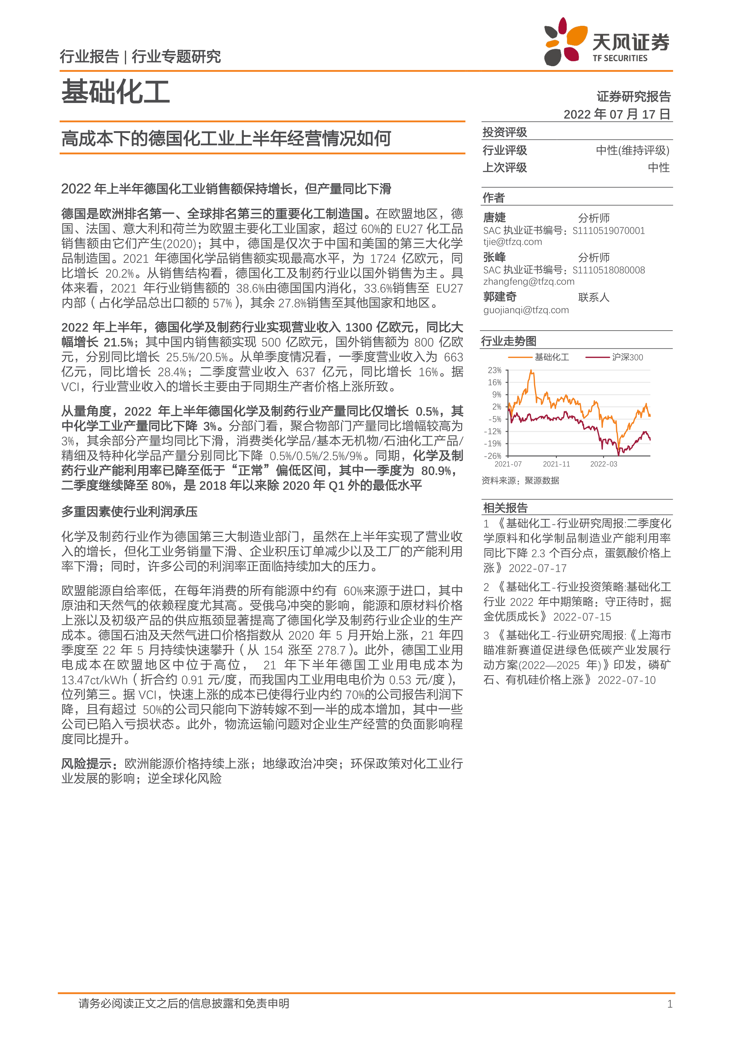 基础化工行业专题研究:高成本下的德国化工业上半年经营情况如何