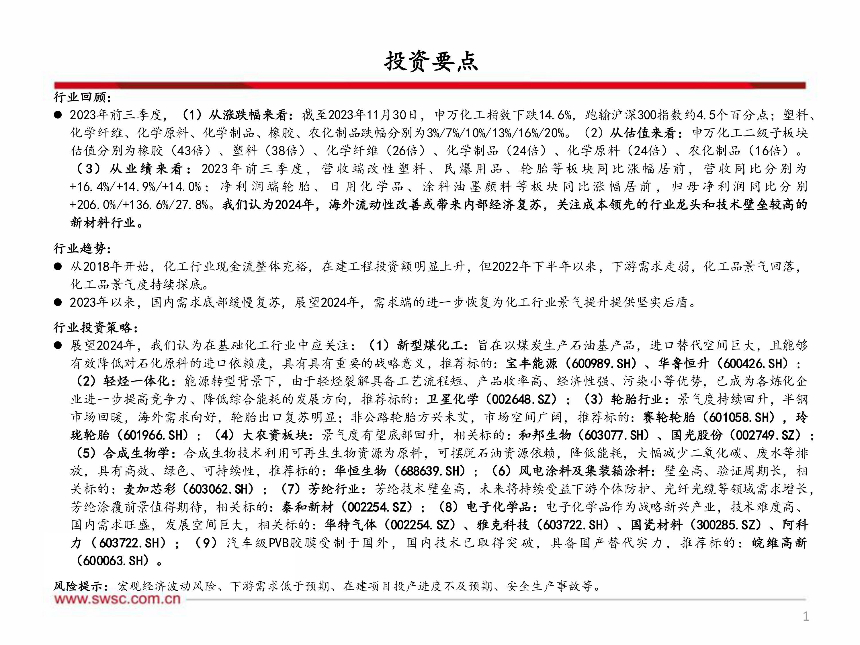 展望2024年,我们认为在基础化工行业中应关注:(1)新型煤化工:旨在以煤炭生产石油基产品,进口替代空间巨大,且能够有效降低对石化原料的进口依赖度,具有具有重要的战略意义,推荐标的:宝丰能源(600989.SH)、华鲁恒升(600426.SH);(2)轻烃一体化:能源转型背景下,由于轻烃裂解具备工艺流程短、产品收率高、经济性强、污染小等优势,已成为各炼化企业进一步提高竞争力、降低综合能耗的发展方向,推荐标的:卫星化学(002648.SZ);(3)轮胎行业:景气度持续回升,半钢市场回暖,海外需求向好,轮胎出口复苏明显;非公路轮胎方兴未艾,市场空间广阔,推荐标的:赛轮轮胎(601058.SH),玲珑轮胎(601966.SH);(4)大农资板块:景气度有望底部回升,相关标的:和邦生物(603077.SH)、国光股份(002749.SZ);(5)合成生物学:合成生物技术利用可再生生物资源为原料,可摆脱石油资源依赖,降低能耗,大幅减少二氧化碳、废水等排放,具有高效、绿色、可持续性,推荐标的:华恒生物(688639.SH);(6)风电涂料及集装箱涂料:壁垒高、验证周期长,相关标的:麦加芯彩(603062.SH);(7)芳纶行业:芳纶技术壁垒高,未来将持续受益下游个体防护、光纤光缆等领域需求增长,芳纶涂覆前景值得期待,相关标的:泰和新材(002254.SZ);(8)电子化学品:电子化学品作为战略新兴产业,技术难度高、国内需求旺盛,发展空间巨大,相关标的:华特气体(002254.SZ)、雅克科技(603722.SH)、国瓷材料(300285.SZ)、阿科力(603722.SH);(9)汽车级PVB胶膜受制于国外,国内技术已取得突破,具备国产替代实力,推荐标的:皖维高新(600063.SH)。