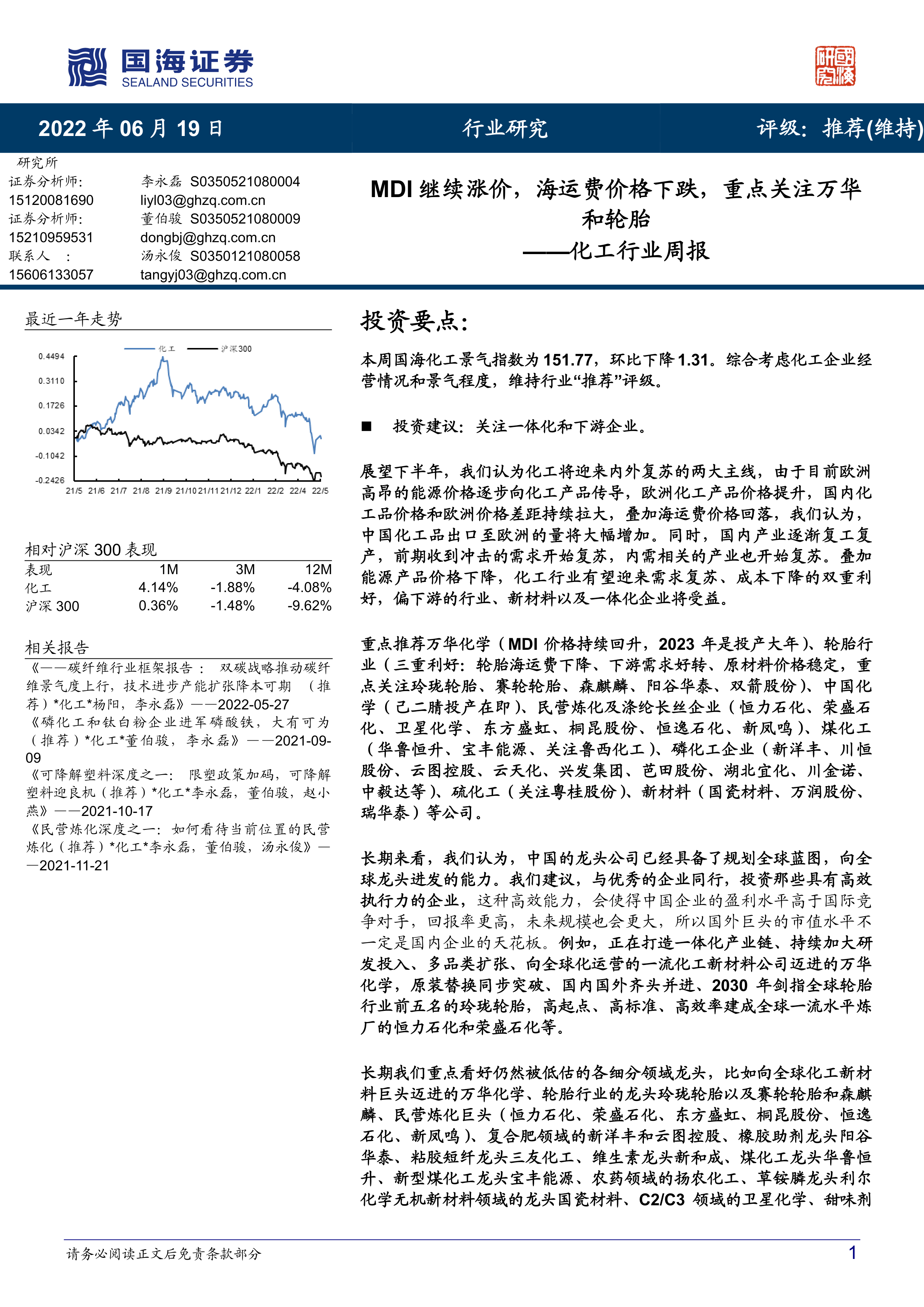 本报告的核心观点是:尽管本周国海化工景气指数环比下降1.31%,但综合考虑化工企业经营情况和景气程度,维持化工行业“推荐”评级。下半年,化工行业有望迎来内外复苏的两大主线:一是欧洲高昂能源价格传导至化工产品,导致欧洲化工产品价格上涨,国内外价格差距扩大,叠加海运费下降,利好中国化工品出口欧洲;二是国内产业复工复产,需求复苏,叠加能源价格下降,将带来需求复苏和成本下降的双重利好。下游行业、新材料和一体化企业将从中受益。重点关注万华化学(MDI价格持续回升,2023年是投产大年)、玲珑轮胎(轮胎海运费下降、下游需求好转、原材料价格稳定)、以及其他细分领域龙头企业。