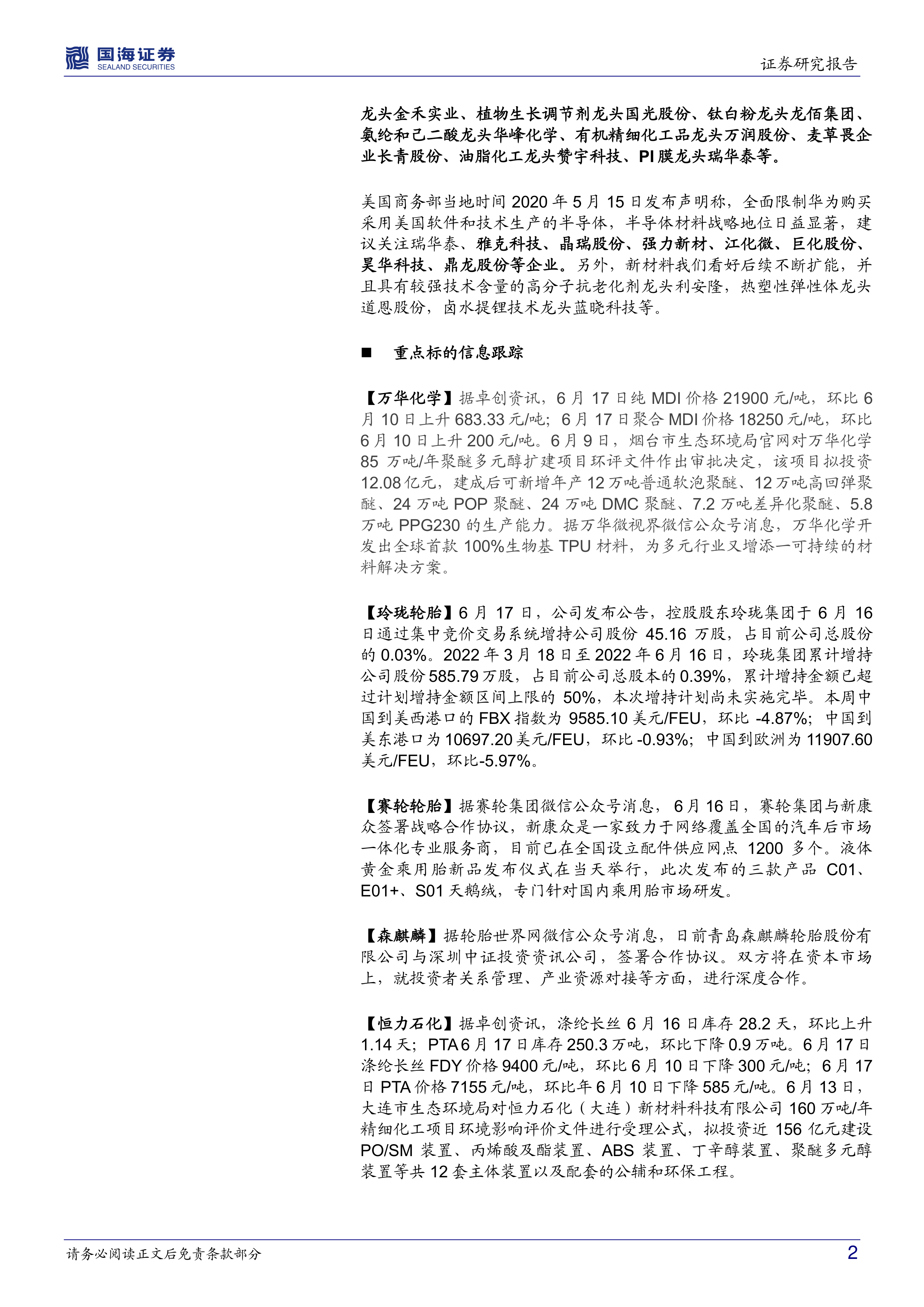 化工行业周报:MDI继续涨价,海运费价格下跌,重点关注万华和轮胎