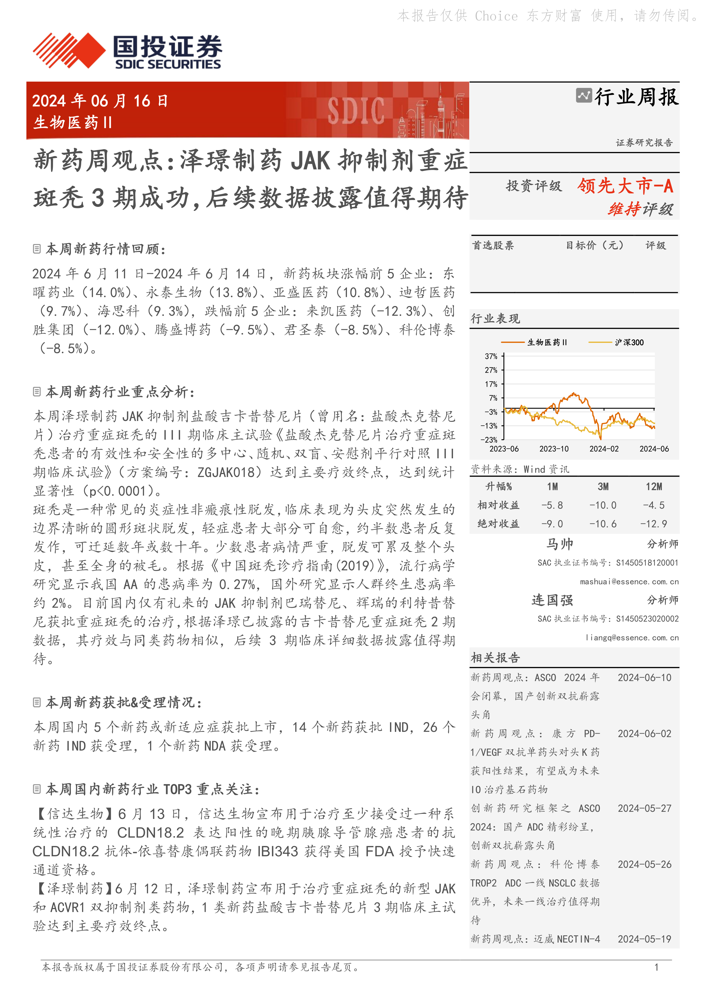 本报告的核心观点是:泽璟制药JAK抑制剂盐酸吉卡昔替尼片治疗重症斑秃的III期临床试验取得成功,达到主要疗效终点,为其后续市场竞争力奠定了基础。同时,报告分析了本周生物医药行业整体市场表现,包括新药板块涨跌幅前五企业、新药获批及受理情况,以及国内外重点关注的新药研发进展。