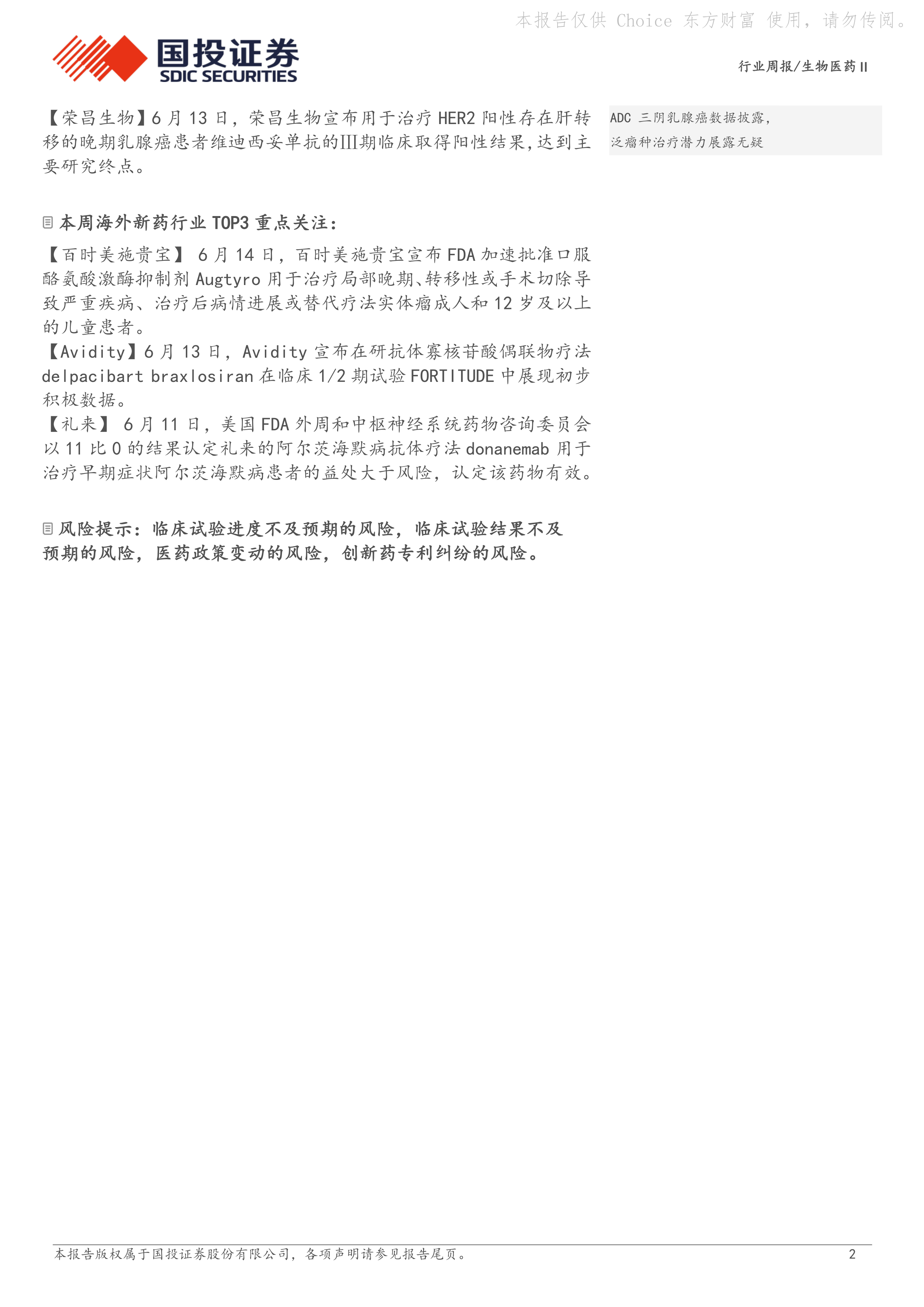 风险提示:临床试验进度不及预期的风险,临床试验结果不及预期的风险,医药政策变动的风险,创新药专利纠纷的风险。