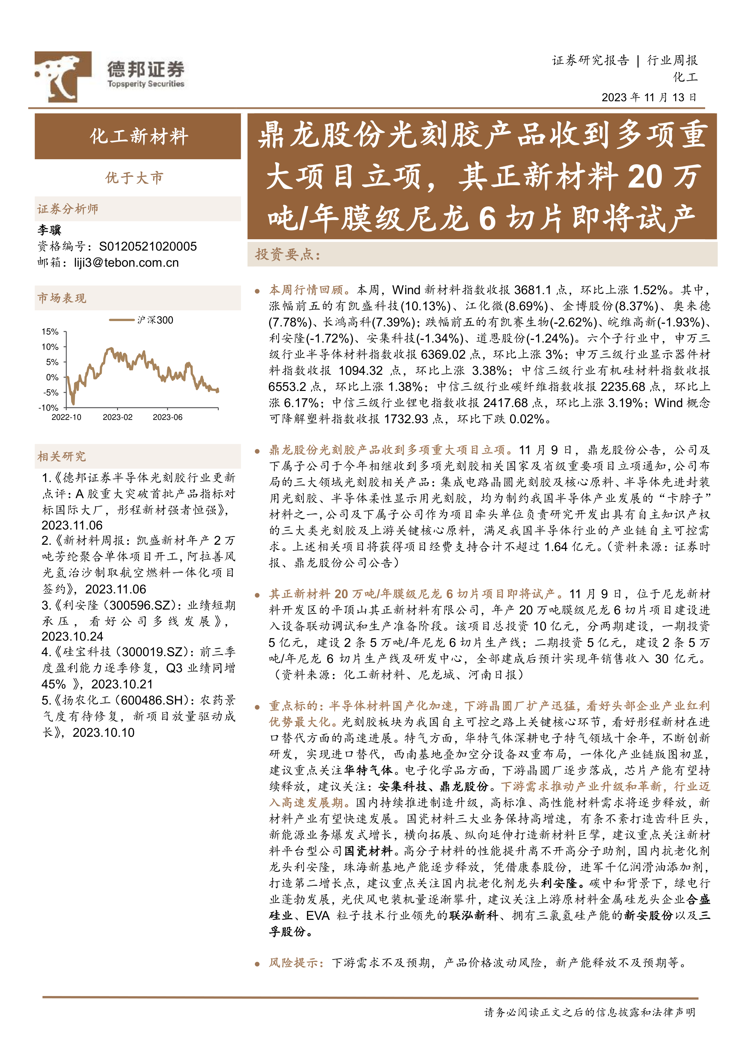 化工新材料行业周报:鼎龙股份光刻胶产品收到多项重大项目立项,其正新材料20万吨/年膜级尼龙6切片即将试产