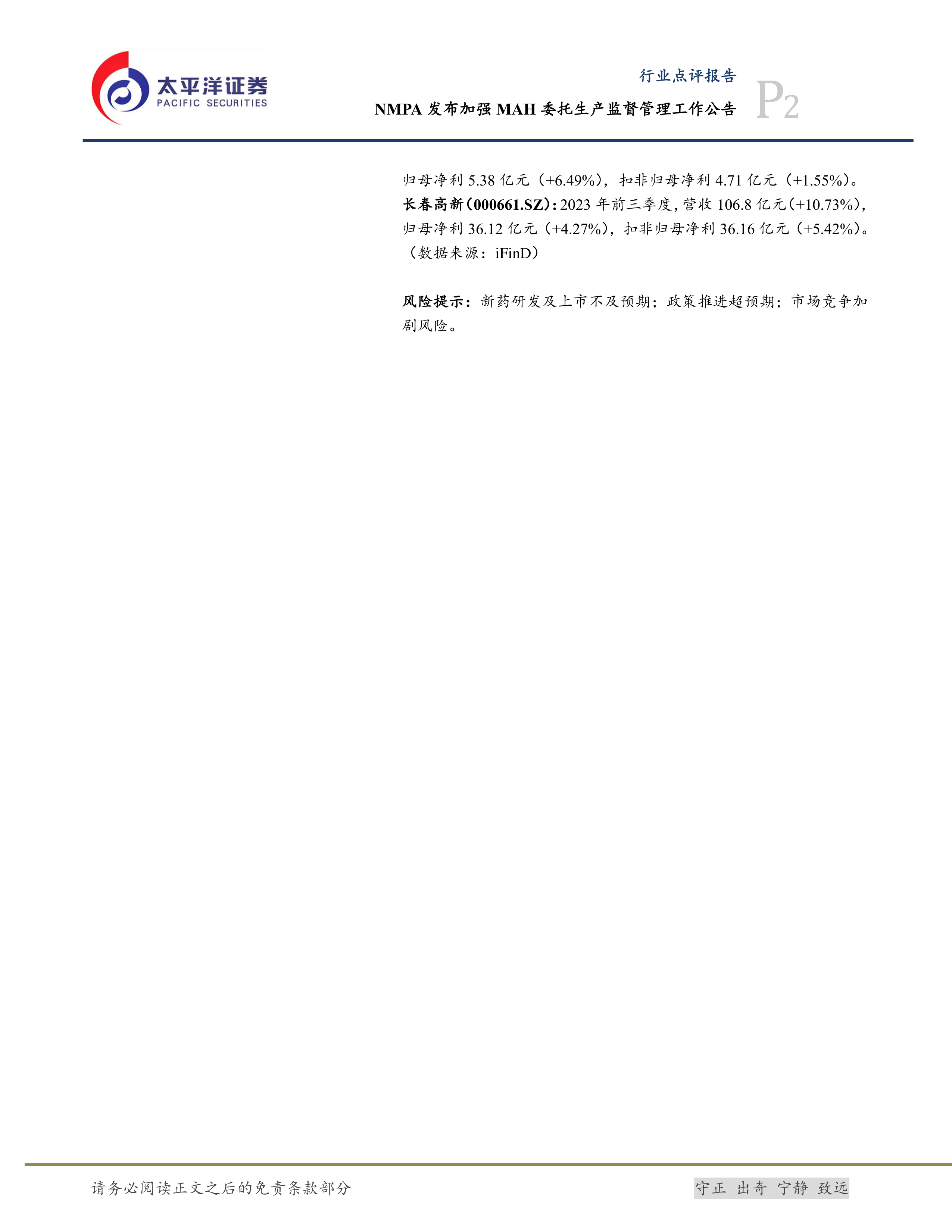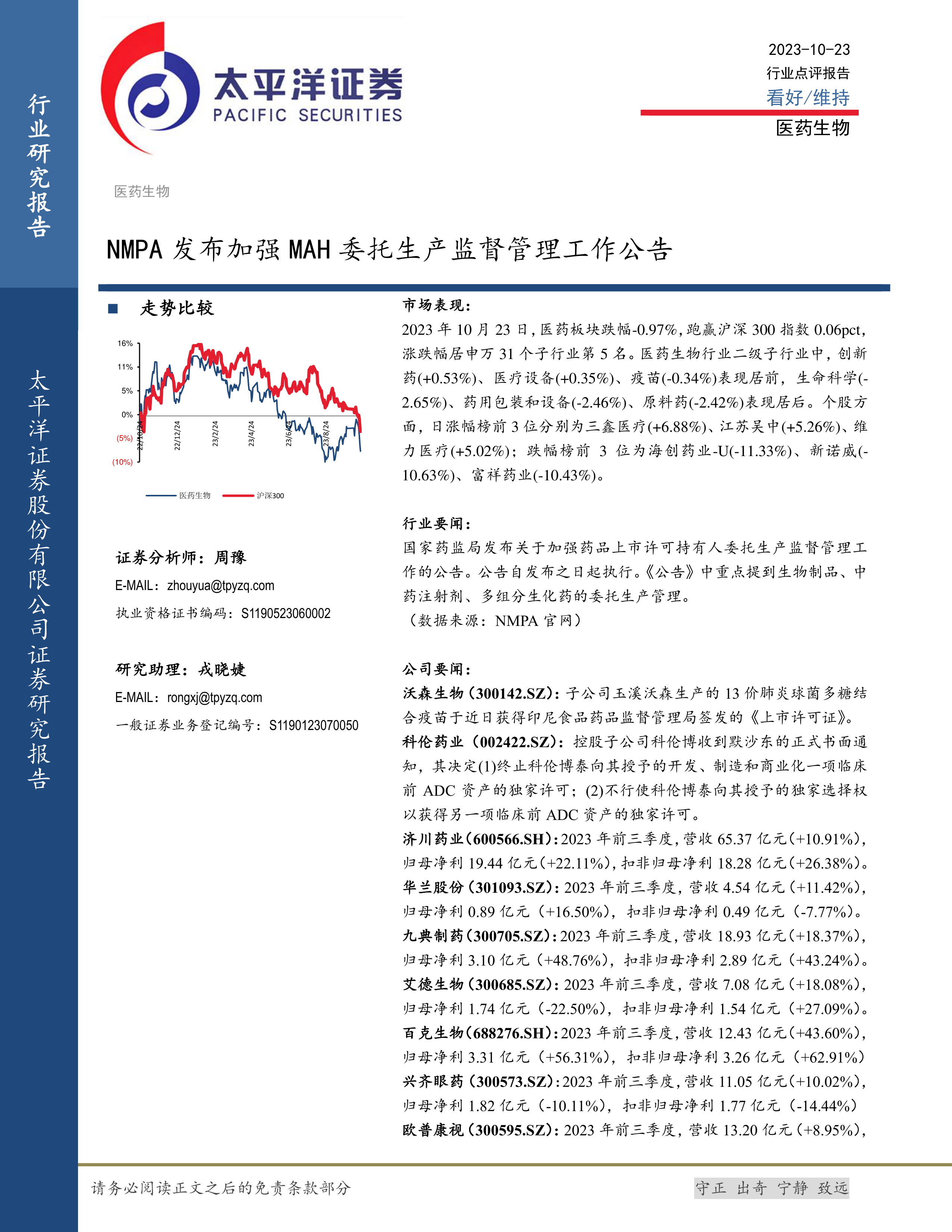 本报告的核心观点是:医药生物行业在2023年10月23日表现略好于大盘,但个股表现分化明显。国家药监局发布的加强MAH委托生产监督管理工作公告对行业监管加强,值得关注。部分公司三季度业绩表现亮眼,但也存在一些公司业绩下滑的情况。