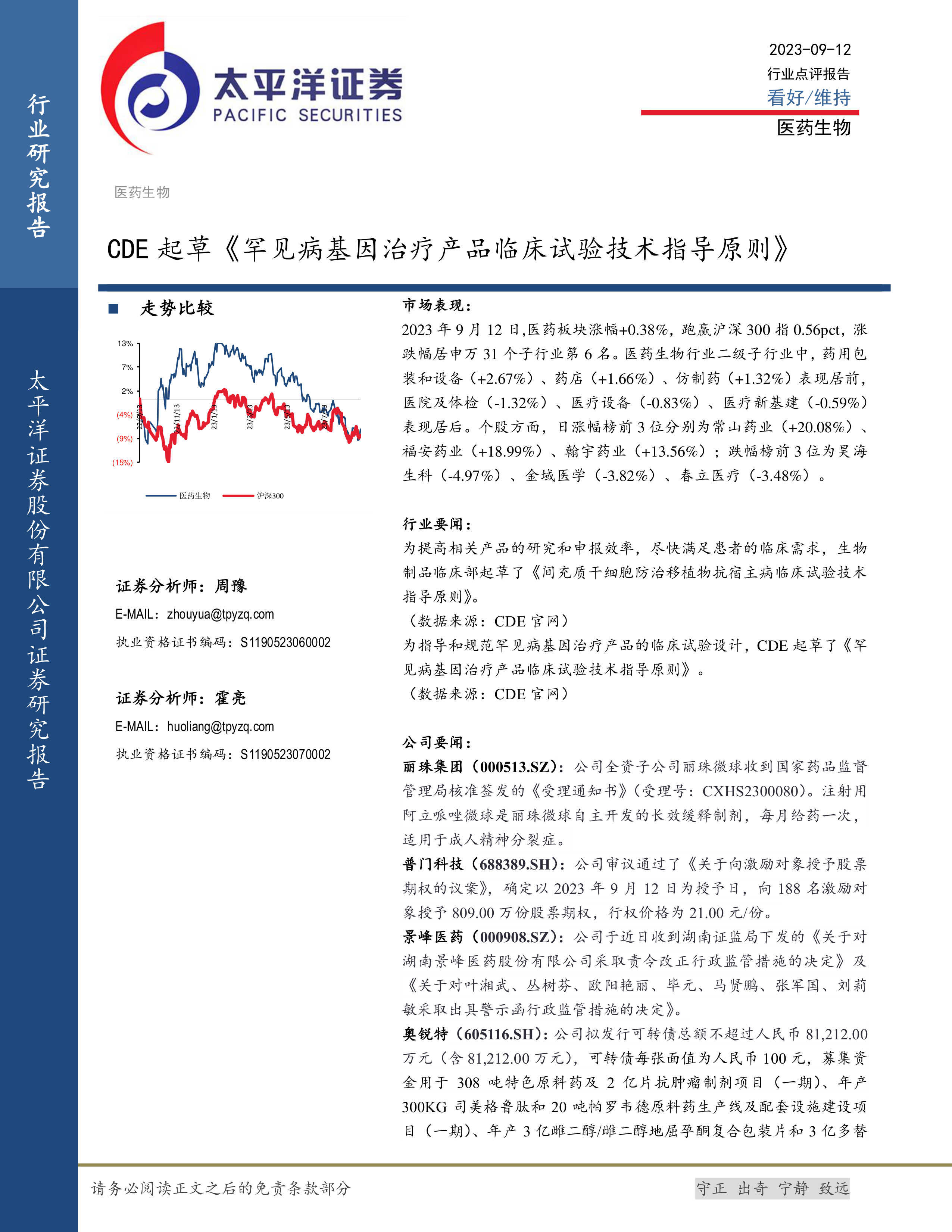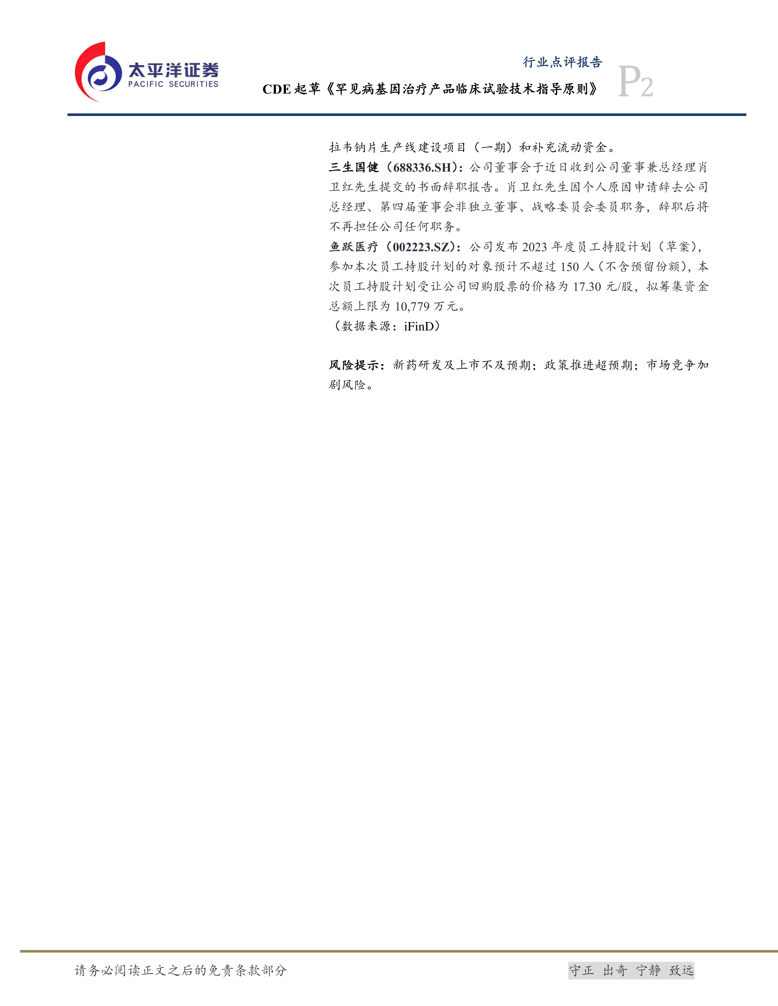 本报告对医药生物行业近期表现进行了分析,指出行业整体表现稳健,但细分领域发展存在差异。CDE发布的指导原则为罕见病基因治疗领域发展提供了政策支持,带来新的机遇。同时,报告也分析了多家医药生物公司的动态,并提示了行业和公司面临的风险。投资者应密切关注行业政策变化和公司经营状况,谨慎投资。 报告中提供的投资评级仅供参考,不构成投资建议。