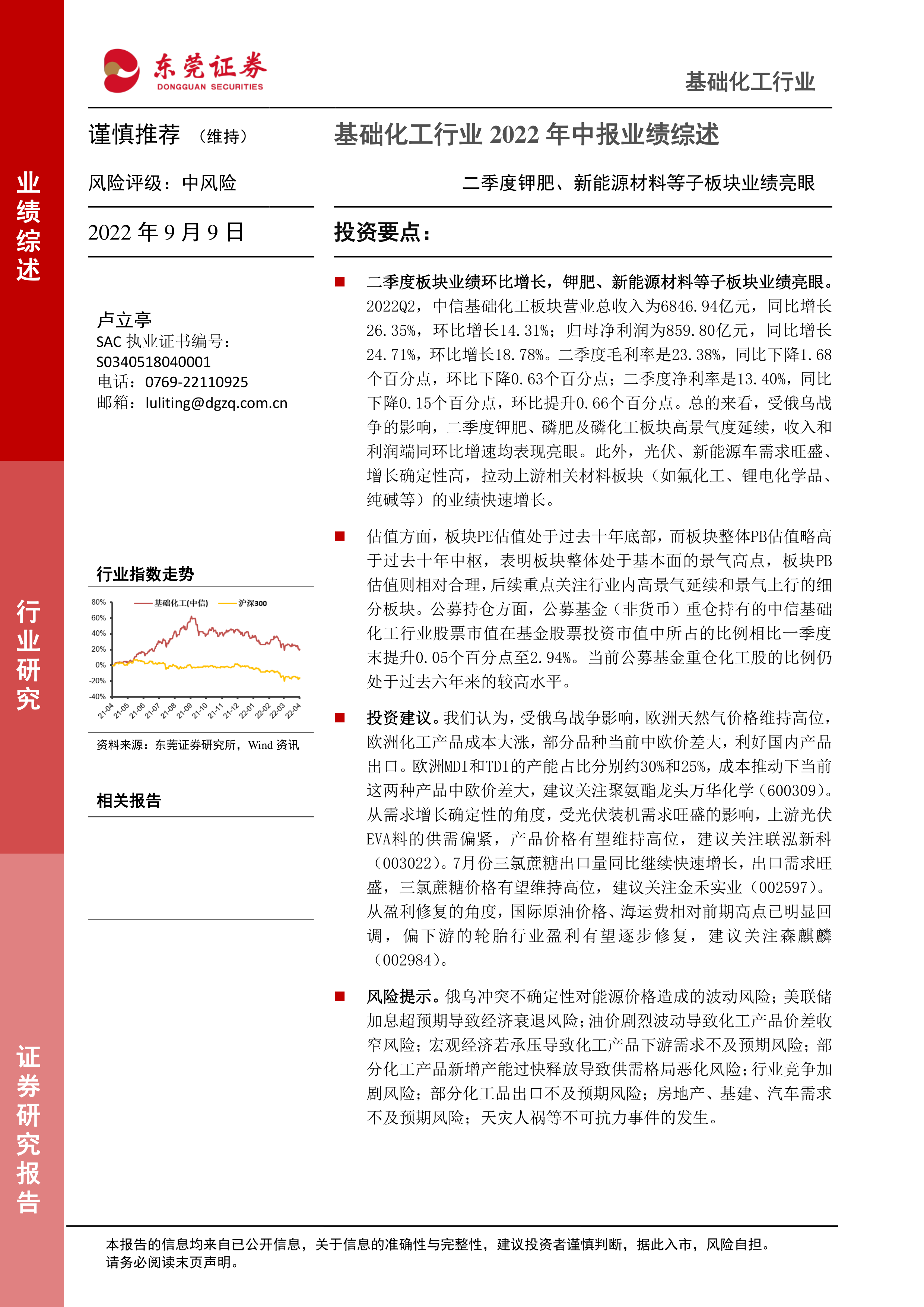 本报告基于东莞证券研究所发布的《基础化工行业2022年中报业绩综述》进行分析,核心观点如下: