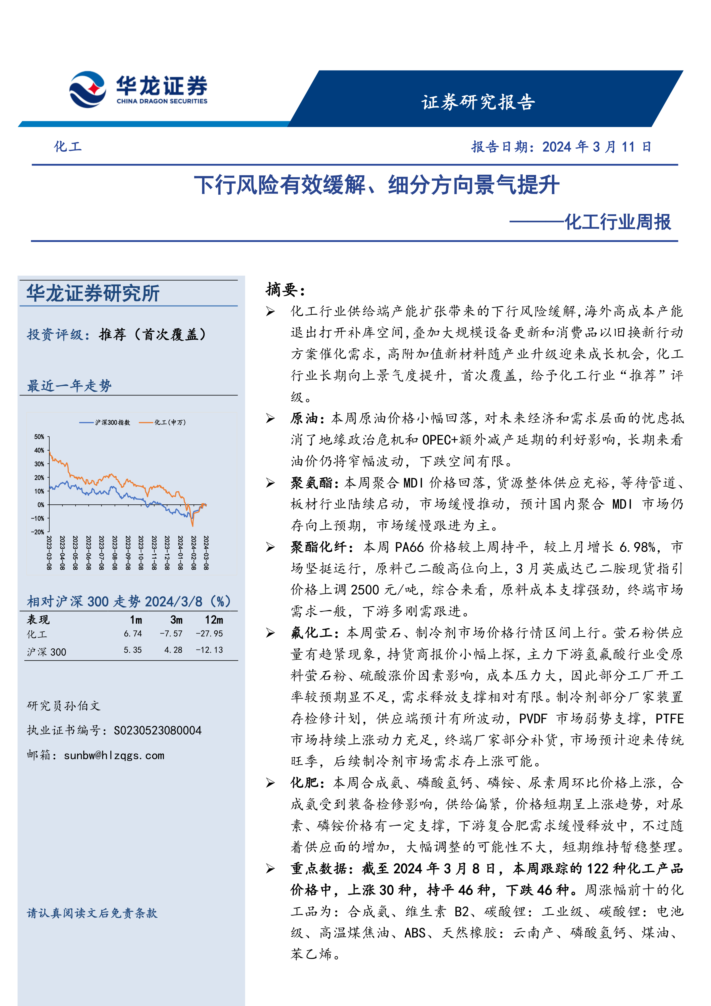 本报告通过对化工行业一周市场表现、关键数据、行业要闻、重点公司公告等信息的综合分析,得出化工行业下行风险有效缓解、细分方向景气提升的结论。报告认为,国家政策的支持、产业升级带来的机遇以及部分细分领域的供需改善,将推动化工行业长期向上景气度提升。报告最后给出了具体的投资建议和风险提示,为投资者提供参考。 然而,投资者仍需谨慎评估自身风险承受能力,并结合自身情况做出投资决策。 报告中提供的盈利预测数据来源于Wind一致预期,投资者需注意其预测的局限性。