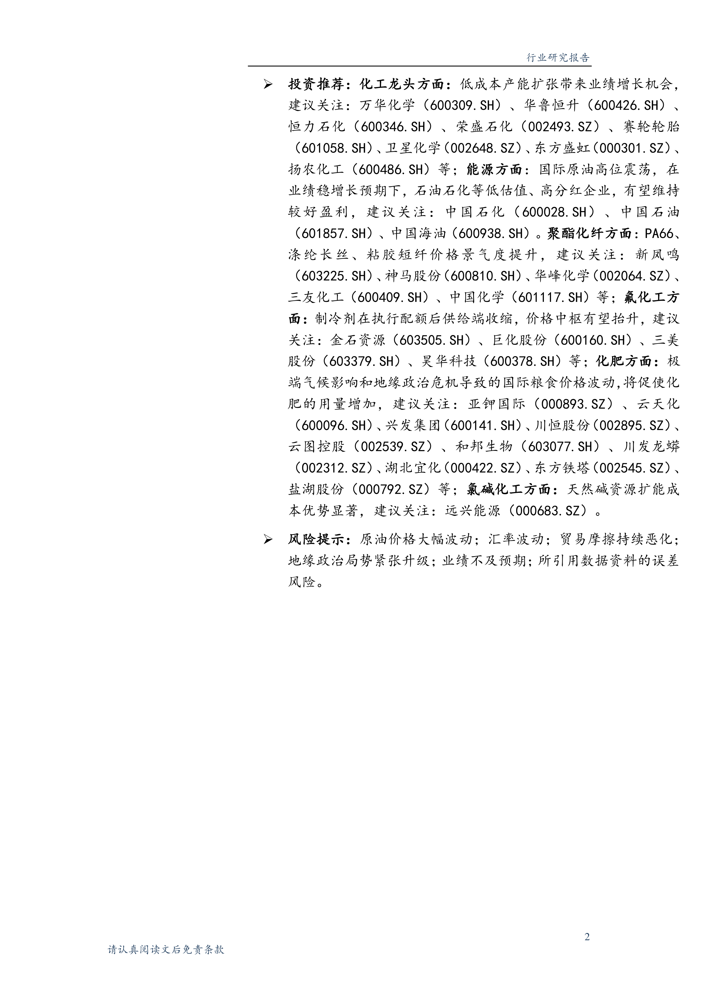 投资推荐:化工龙头方面:低成本产能扩张带来业绩增长机会,建议关注:万华化学(600309.SH)、华鲁恒升(600426.SH)、恒力石化(600346.SH)、荣盛石化(002493.SZ)、赛轮轮胎(601058.SH)、卫星化学(002648.SZ)、东方盛虹(000301.SZ)、扬农化工(600486.SH)等;能源方面:国际原油高位震荡,在业绩稳增长预期下,石油石化等低估值、高分红企业,有望维持较好盈利,建议关注:中国石化(600028.SH)、中国石油(601857.SH)、中国海油(600938.SH)。聚酯化纤方面:PA66、涤纶长丝、粘胶短纤价格景气度提升,建议关注:新凤鸣(603225.SH)、神马股份(600810.SH)、华峰化学(002064.SZ)、三友化工(600409.SH)、中国化学(601117.SH)等;氟化工方面:制冷剂在执行配额后供给端收缩,价格中枢有望抬升,建议关注:金石资源(603505.SH)、巨化股份(600160.SH)、三美股份(603379.SH)、昊华科技(600378.SH)等;化肥方面:极端气候影响和地缘政治危机导致的国际粮食价格波动,将促使化肥的用量增加,建议关注:亚钾国际(000893.SZ)、云天化(600096.SH)、兴发集团(600141.SH)、川恒股份(002895.SZ)、云图控股(002539.SZ)、和邦生物(603077.SH)、川发龙蟒(002312.SZ)、湖北宜化(000422.SZ)、东方铁塔(002545.SZ)、盐湖股份(000792.SZ)等;氯碱化工方面:天然碱资源扩能成本优势显著,建议关注:远兴能源(000683.SZ)。