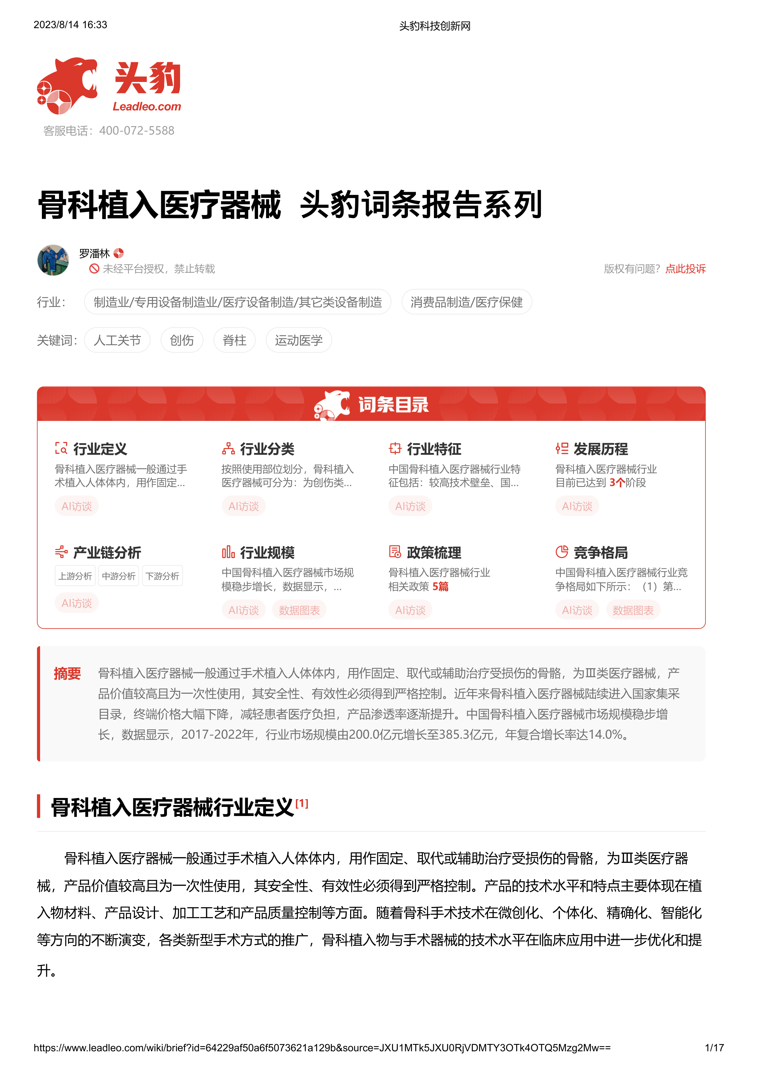 本报告基于头豹科技创新网提供的骨科植入医疗器械行业报告数据,对中国骨科植入医疗器械市场进行分析。报告核心观点如下: